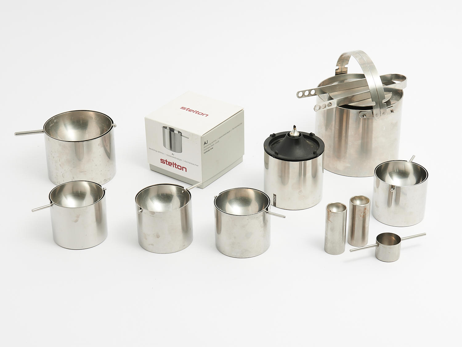 A GROUP OF STELTON STAINLESS STEEL OBJECTS INCLUDING AN ICE BUCKET WITH TONGS, SIX ASHTRAYS, SALT AND PEPPER ETC. H.17.5CM (ICE BUCKET), LEONARD JOEL LOCAL DELIVERY: SMALL