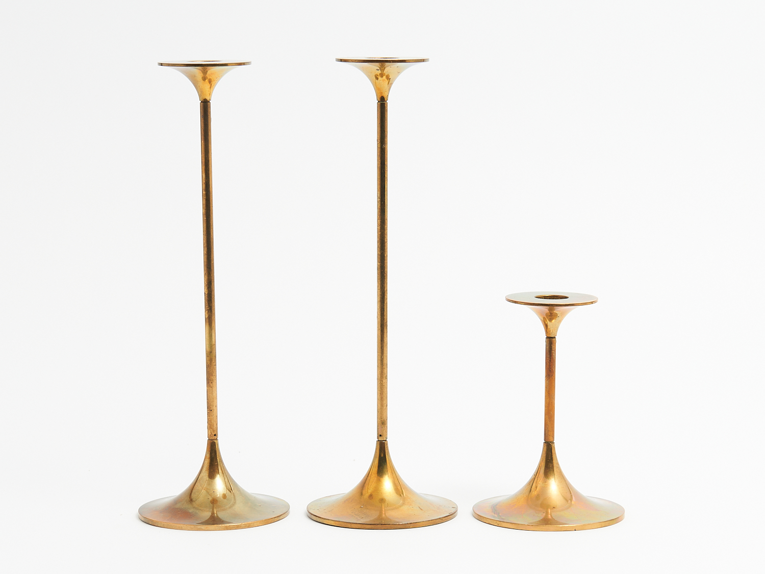 THREE DANISH BRASS CANDLESTICKS H.26.5CM (TALLEST), LEONARD JOEL LOCAL DELIVERY: SMALL