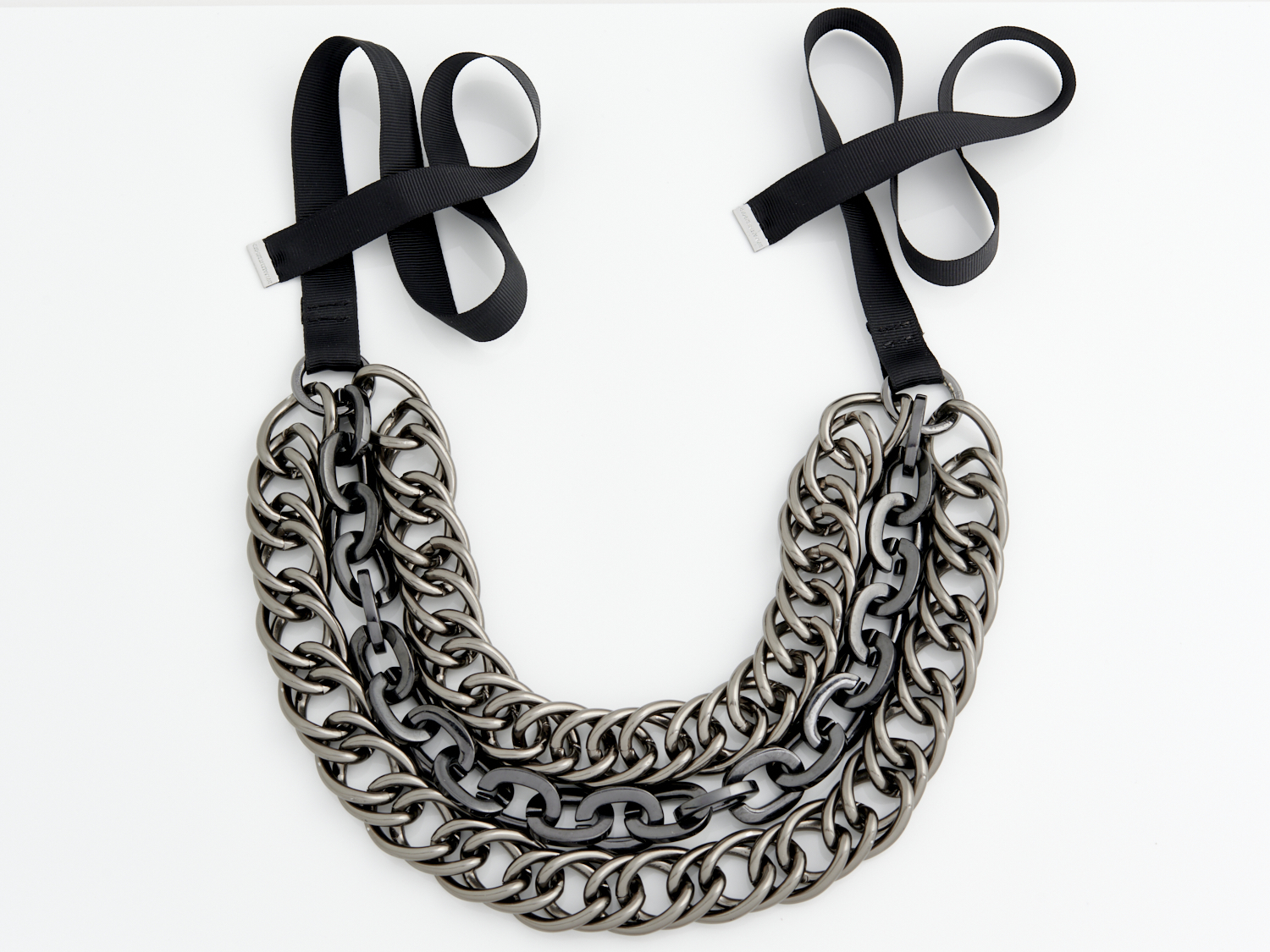 MALENE BIRGER, A THREE CHAIN NECKLACE IN GUNMETAL AND OXIDISED METAL TO A BLACK RIBBON, BOXED