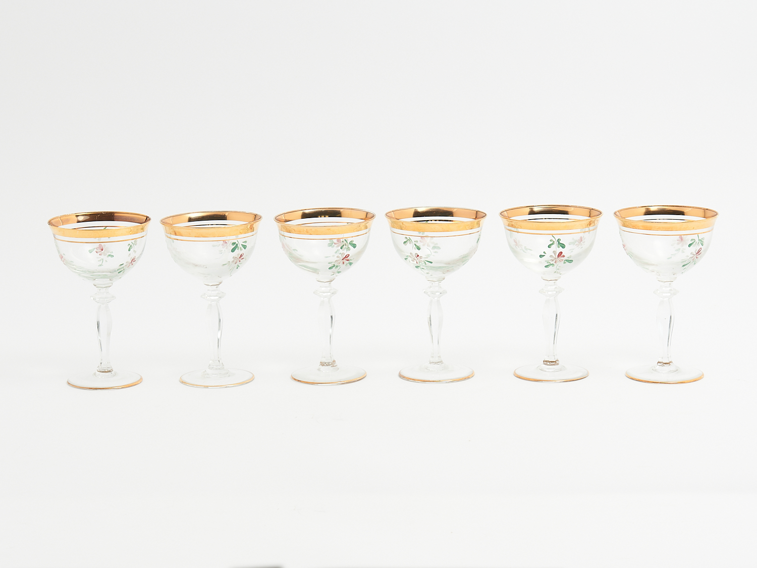 A SET OF SIX CRYSTAL WINES WITH GILDING AND EMAMELLED FLOWER DECORATION H.15CM, LEONARD JOEL LOCAL DELIVERY: MEDIUM