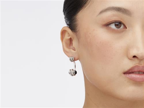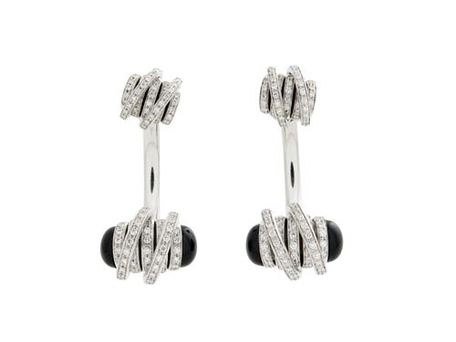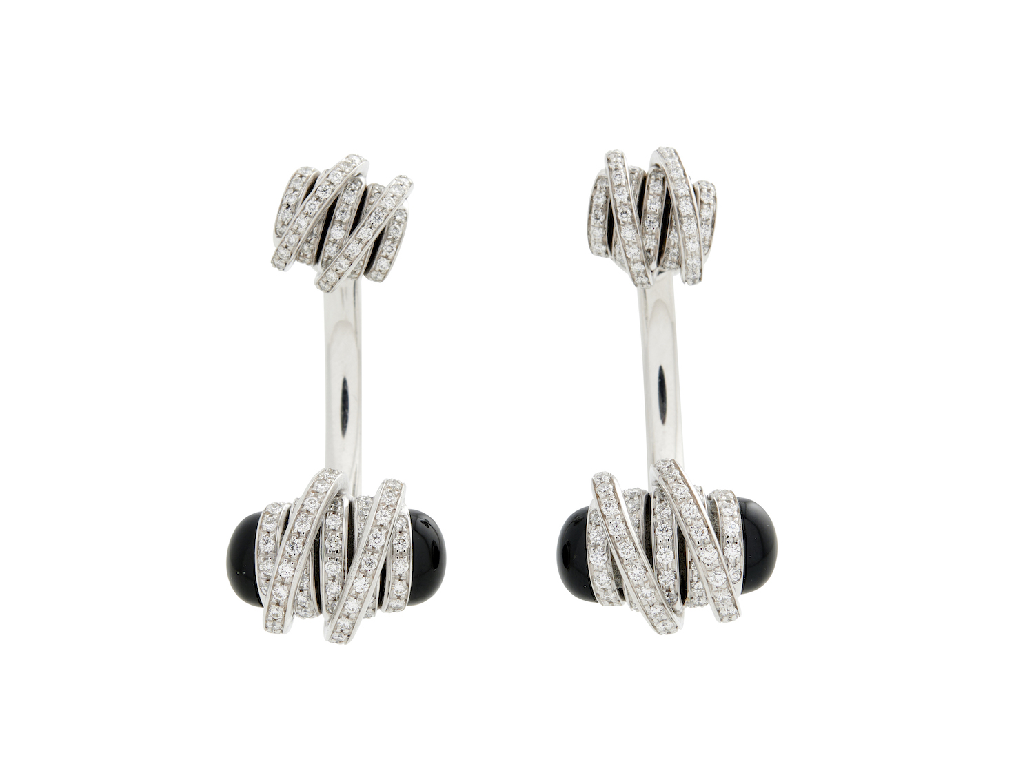 DE GRISOGONO, A PAIR OF ONYX AND DIAMOND 'TOI ET MOI' EARRINGS IN 18CT WHITE GOLD, EACH EARRING COMPRISING A DETACHABLE CURVED BAR DROP TERMINATING IN AN OVAL SHAPED SPIRAL SET WITH BRILLIANT-CUT DIAMONDS AND FLANKED BY OVAL ONYX CUT EN CABOCHON, TO AN OVAL SHAPED SPIRAL DIAMOND CLUSTER SURMOUNT, THE DIAMONDS TOGETHER WEIGHING APPROXIMATELY 1.05 CARATS, SIGNED DE GRISOGONO, TO POST AND LA POUSETTE FITTINGS, LENGTH APPROXIMATELY 35MM, ACCOMPANIED BY A DE GRISOGONO BOX