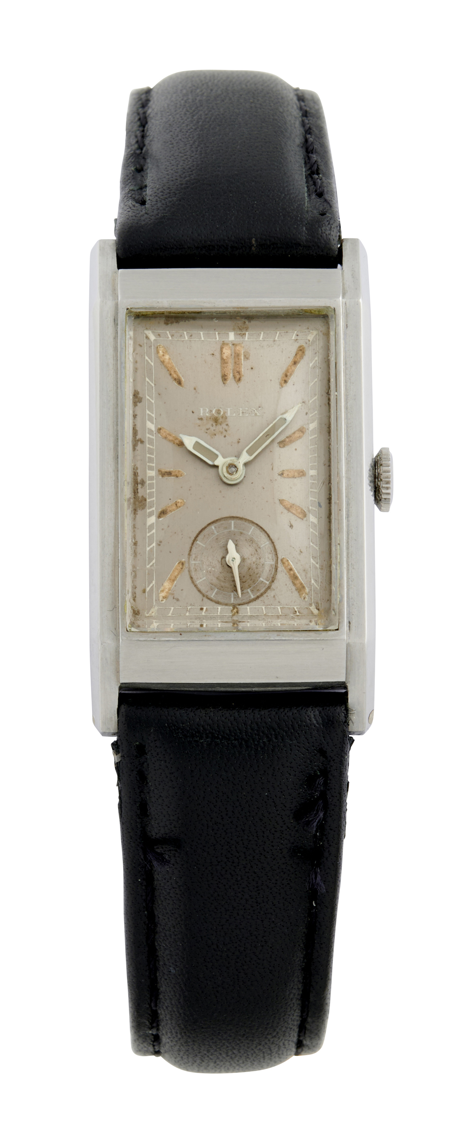 Dial: silvered, applied baton hour markers and subsidiary dial at 6, pointed baton hands