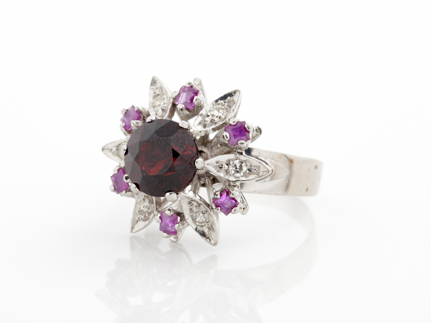 A GARNET, RUBY AND DIAMOND RING IN 9CT WHITE GOLD, SIZE N, 6.6GMS