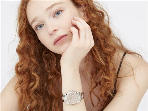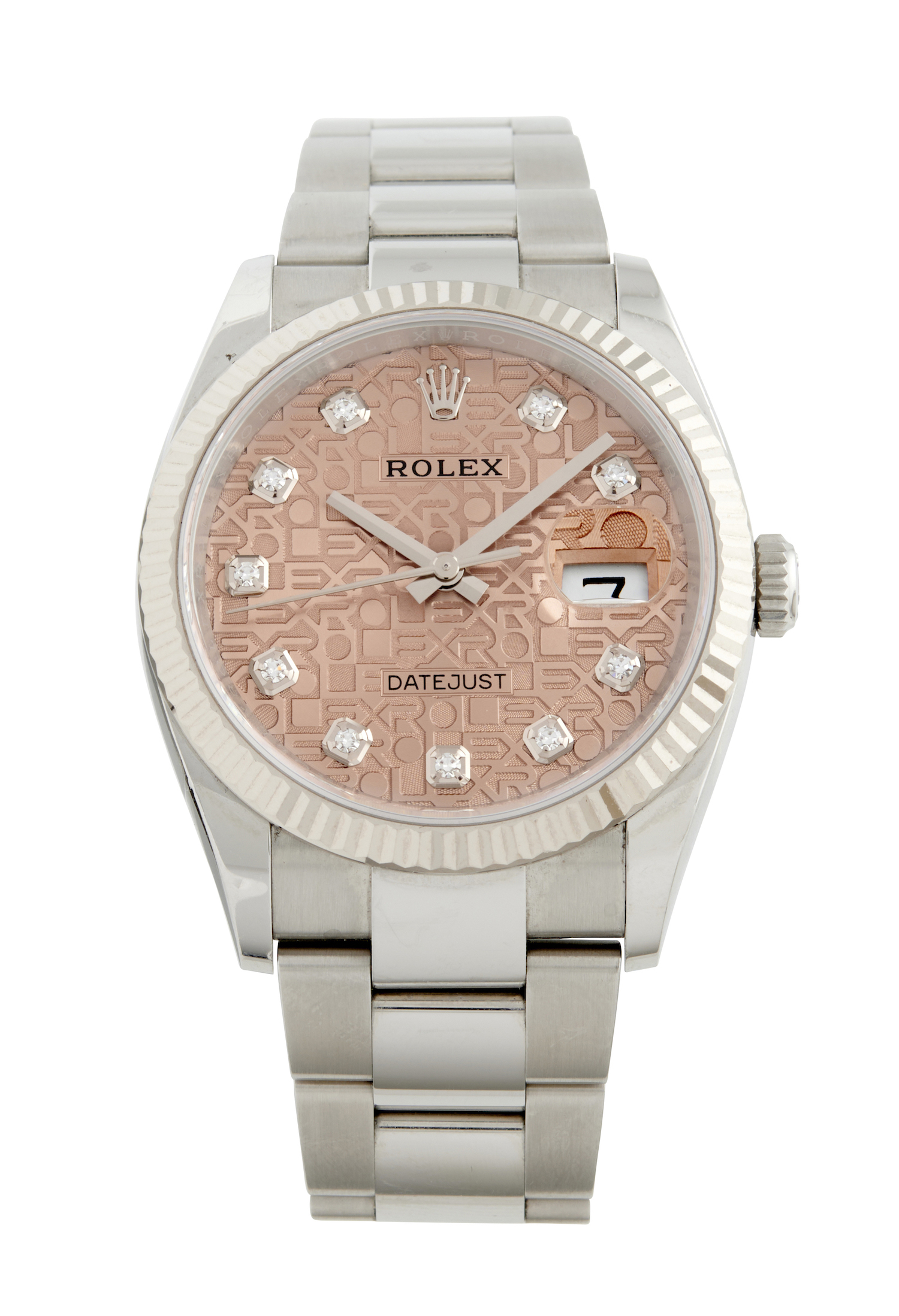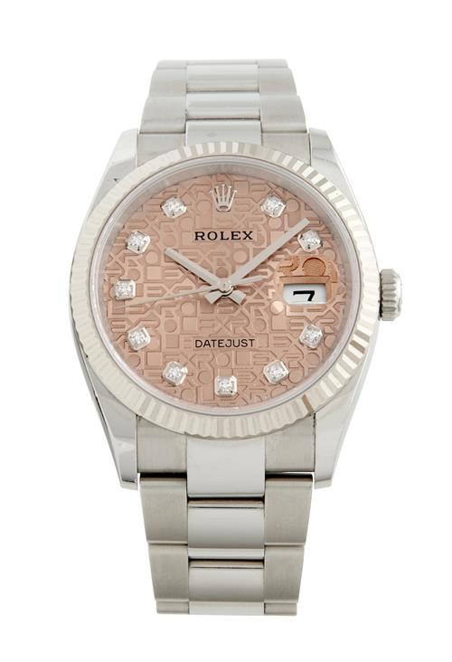 Dial: pink Jubilee, diamond-set hour markers, magnified date aperture at 3