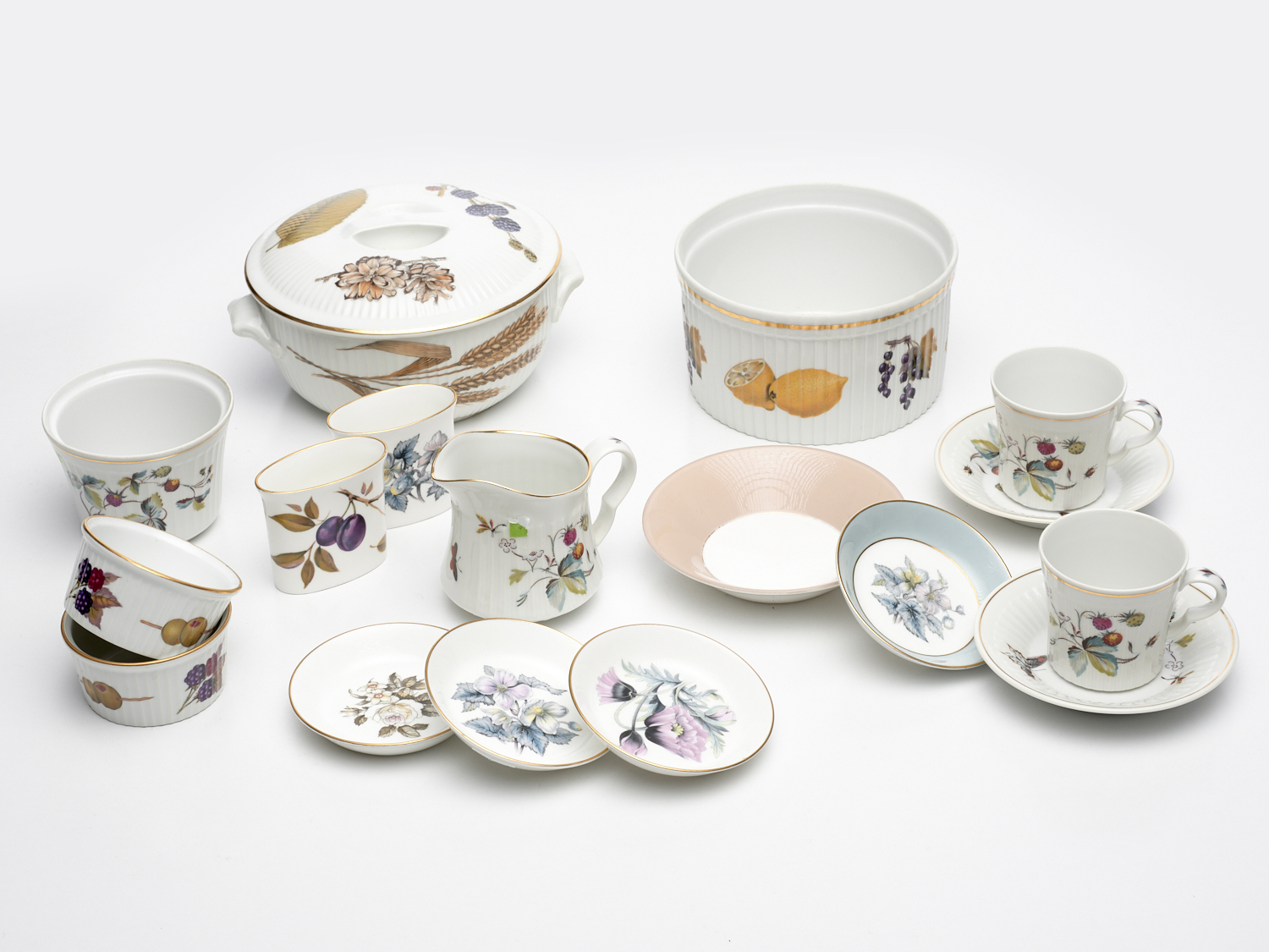 A COLLECTION OF ROYAL WORCESTER INCLUDING JUG, CUP/SAUCERS, TUREEN, DISHES AND BOWL DIA.15.5CM (LARGEST), LEONARD JOEL LOCAL DELIVERY: MEDIUM