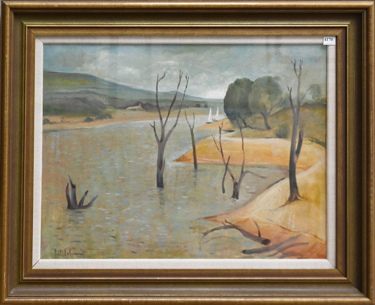 BILL COLEMAN, LANDSCAPE AND BOATS, OIL ON BOARD, SIGNED LOWER LEFT, 44 X 59CM, FRAME SIZE: 63 X 80CM
