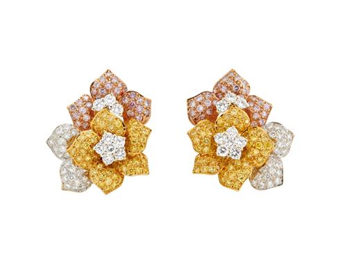 Each earring modelled as clusters of flowerheads, pavé-set throughout with brilliant-cut colourless, fancy pink and fancy yellow diamonds together weighing approximately 2.70 carats, to post and clip fittings, length approximately 30mm.