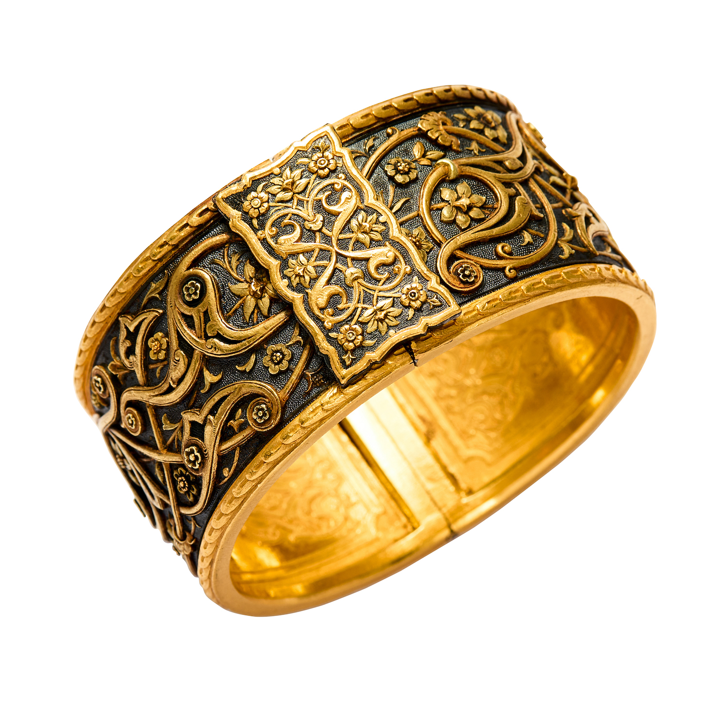 The 31mm wide oval hinged bangle is continuously decorated in a scroll and foliate motif between a textured edge, inner circumference 167mm, total gross weight approximately 113 grams.