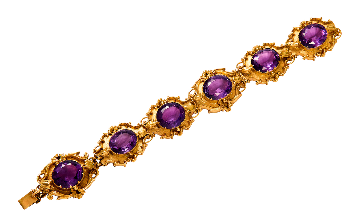 Composed of six hinged plaques, each centring a claw-set oval-shaped amethyst upon a decorative applied surround of scroll and foliate motif, the amethysts together weighing approximately 52.65 carats, the end link with two push clasps is detachable, mounted in 18ct gold, length 82mm, width 26mm, total gross weight approximately 39 grams.