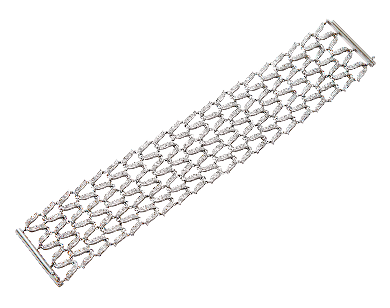 Designed as a 32mm wide articulated strap of continuous openwork wave design accented with bead-set round brilliant-cut diamonds throughout, completed by a slide clasp, the diamonds together weighing approximately 5.29 carats, mounted in 18ct white gold, length 170mm, total gross weight approximately 37 grams.