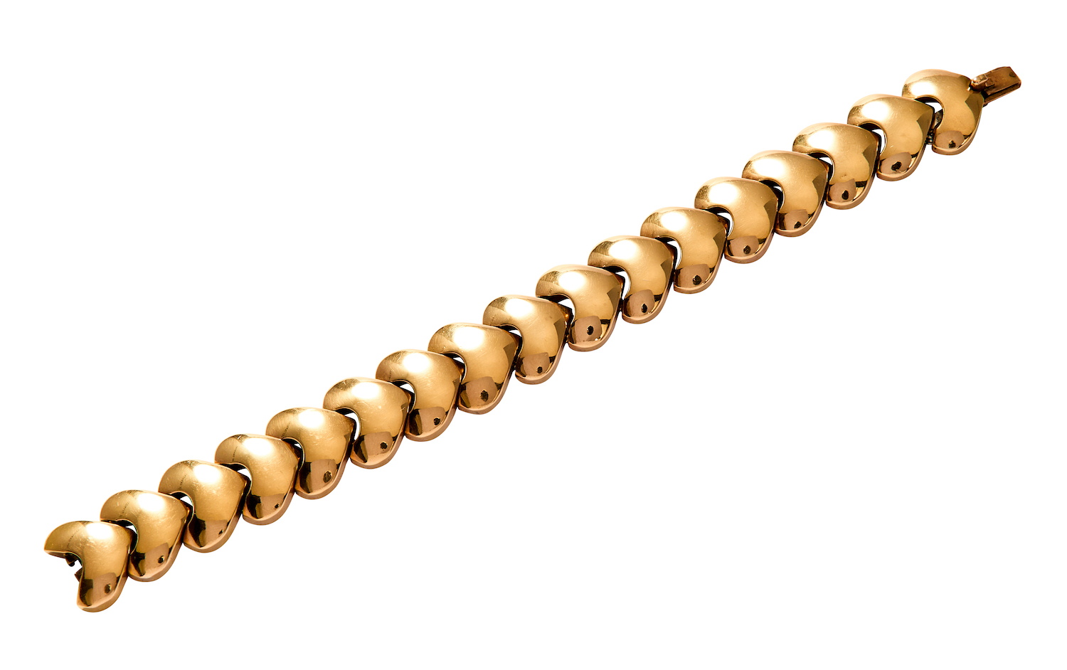 The 18ct gold articulated bracelet composed of heart motif links, length 190mm, width 18mm, total gross weight approximately 59 grams.