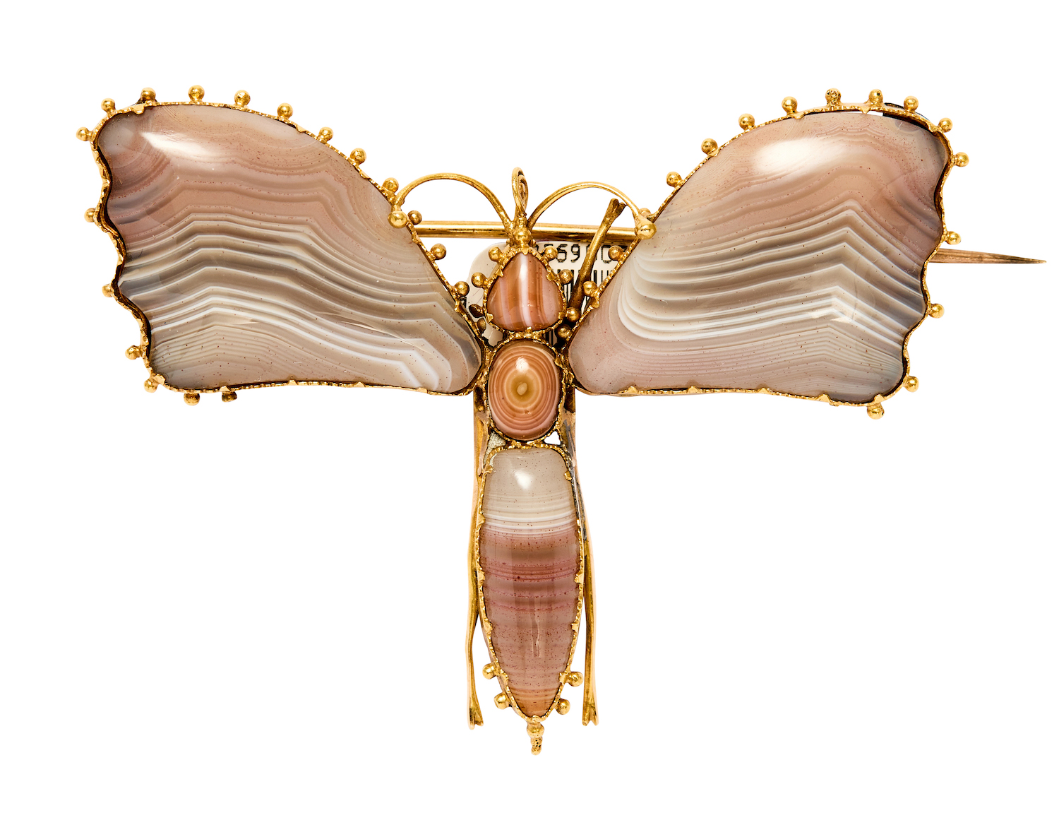 Modelled as a butterfly, composed of banded agate upon a decorative applied frame, mounted in 20ct gold with a 9ct gold brooch pin, length 56mm, width 42mm, total gross weight approximately 9 grams.