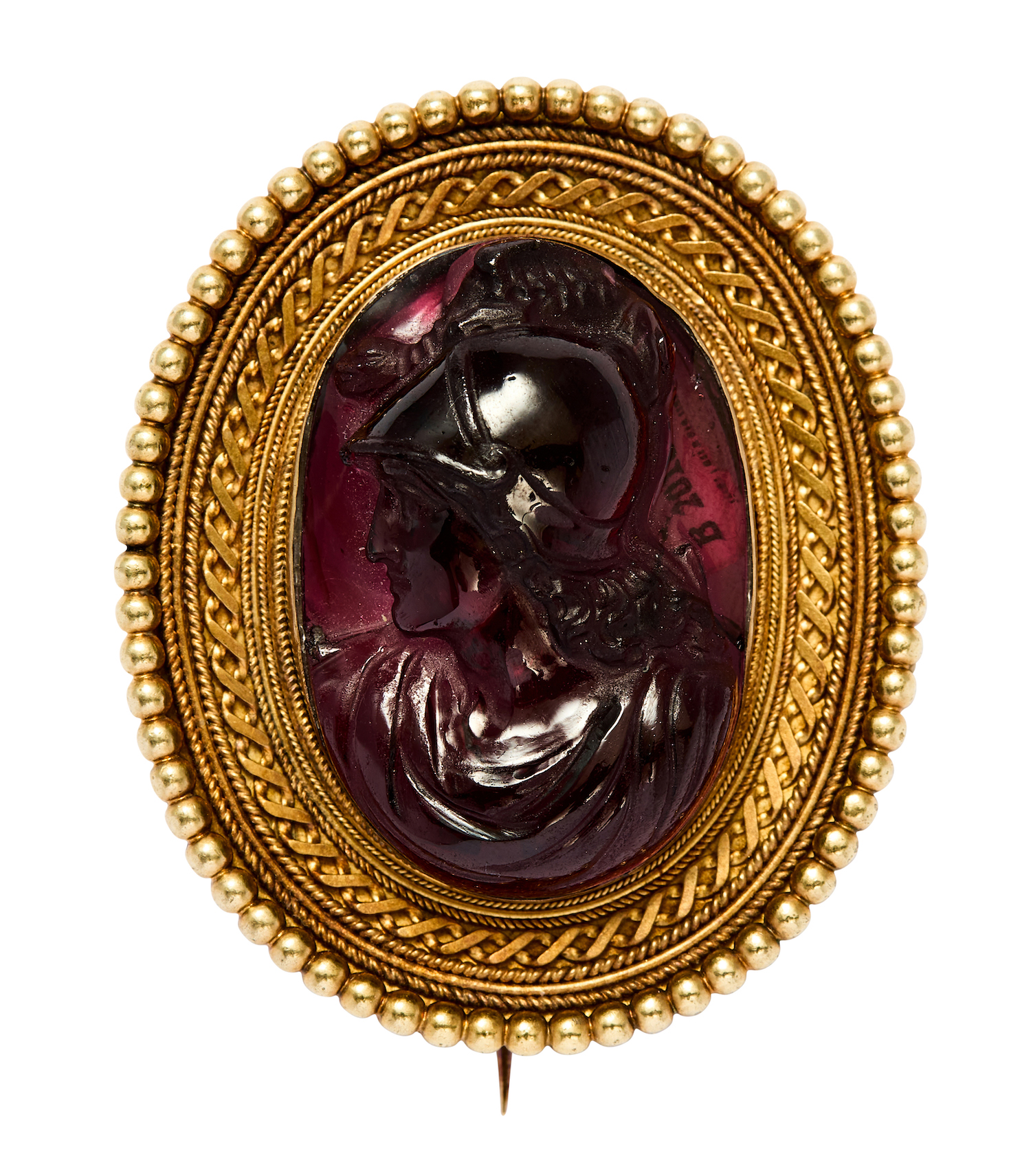 In our opinion, the portrait is well carved with minor areas of abrasion on the edges of carving and minor chips and scratches to the surface. The garnet is deep purplish red with characteristic inclusions visible to naked eye and under magnification. The frame shows minor tarnish throughout and scratches to the metal consistent with age and wear.