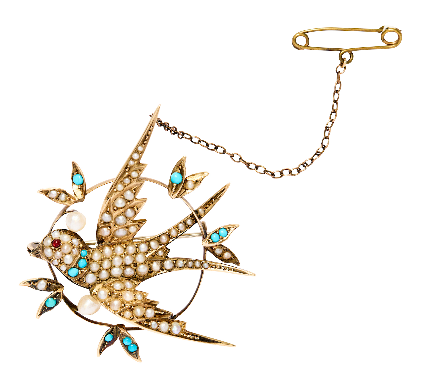 Modelled as a swallow in flight, the bird and round open frame with leaf motifs, accented throughout with seed pearls and turquoise, mounted in 14ct gold with a base metal brooch pin, length 49mm, width 42mm, total gross weight approximately 7 grams, indistinct Australian maker's and assay marks.
