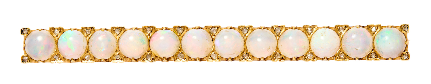 Of bar design, composed of a line of 12 claw-set circular cabochon opals flanked by bead-set rose-cut diamonds, upon a scalloped gallery, mounted in 18ct gold with a 9ct gold brooch pin, length 80mm, total gross weight approximately 15 grams.