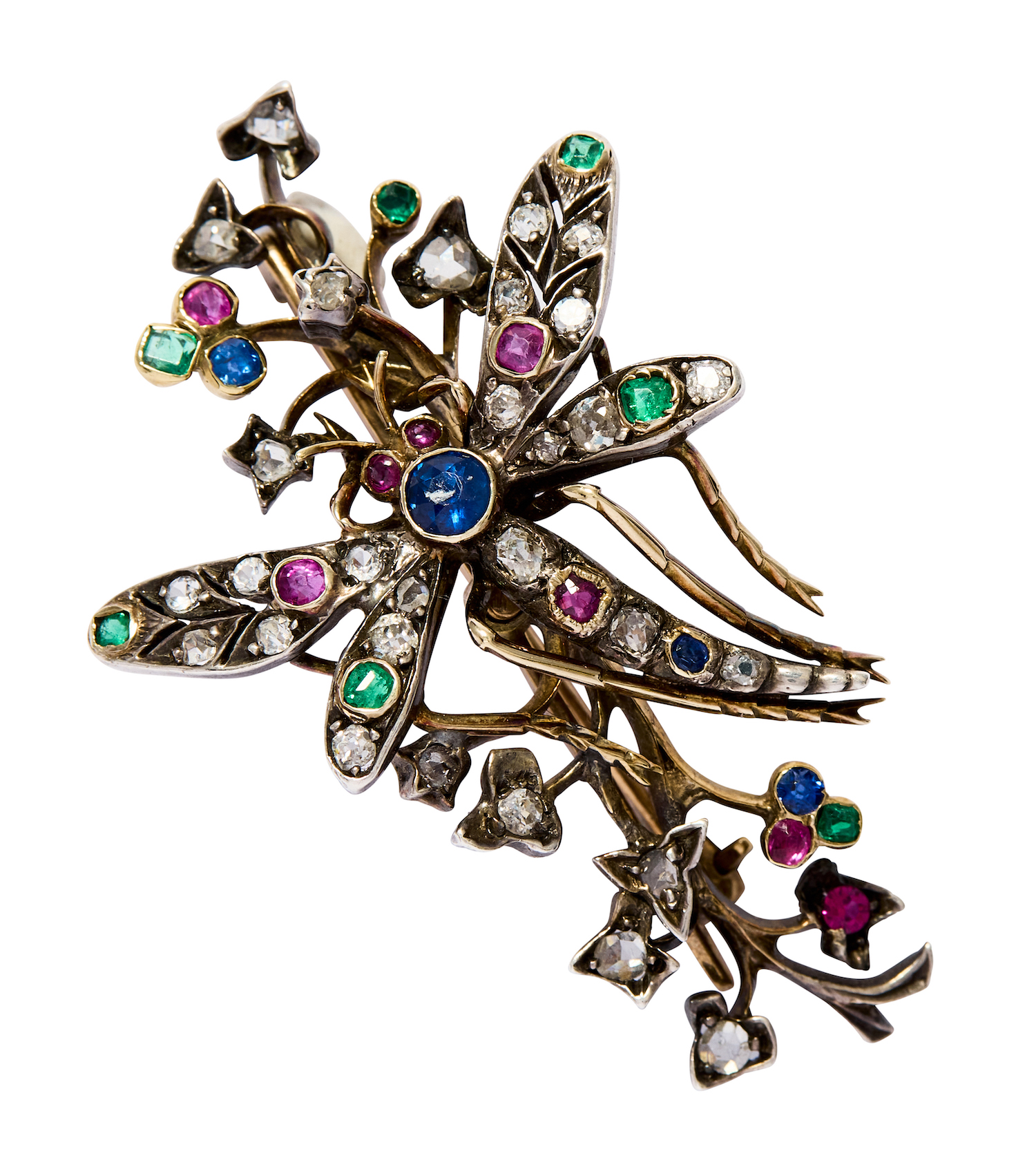 The dragonfly and leaf motifs accented throughout with old-cut and rose-cut diamonds, rubies, sapphires and emeralds, mounted in 9ct gold and silver, length 47mm, width 28mm, total gross weight approximately 8 grams.