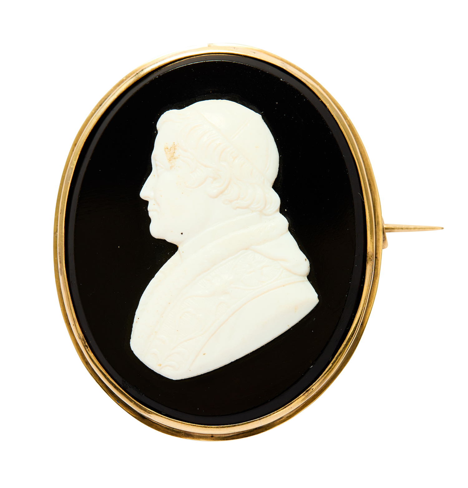 An oval carved banded onyx cameo depicting the portrait of a cardinal, framed by a stepped surround, length 49mm, width 40mm, total gross weight approximately 23 grams.
