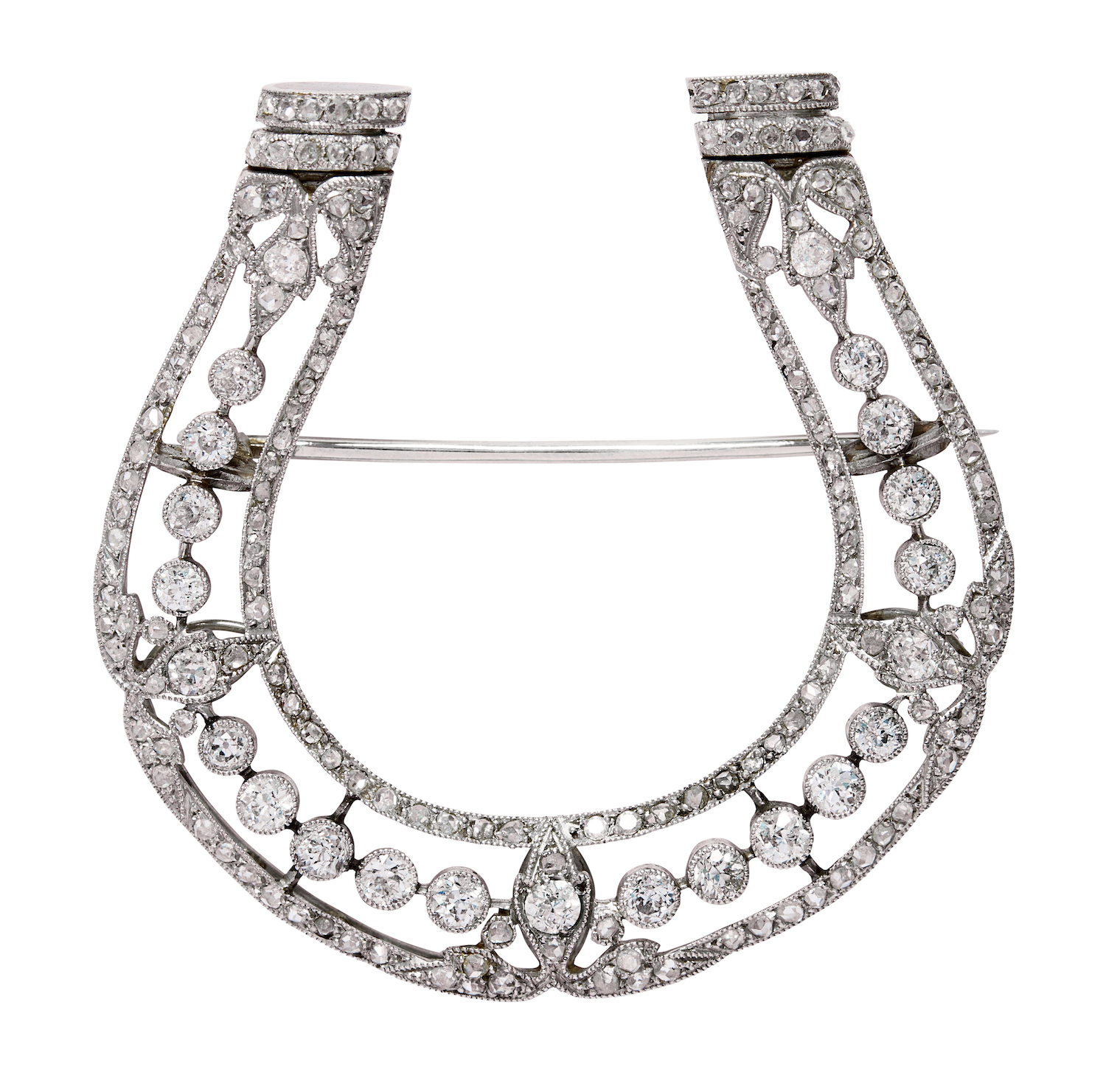 Modelled as an openwork horseshoe, centring a line of millegrain-set early brilliant-cut diamonds, flanked by pavé-set early brilliant-cut diamonds and bead-set rose-cut diamonds together weighing approximately 1.25 carats and 0.82 carats respectively, mounted in platinum with a 9ct white gold brooch pin, length 45mm, width 44mm, total gross weight approximately 12 grams.