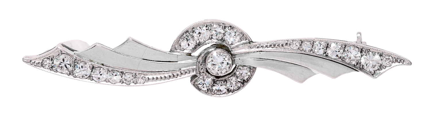 Of ribbon design, centring a bezel-set round brilliant-cut diamond with further round brilliant-cut diamonds bead-set to the surround and two tapered sections, the diamonds together weighing approximately 0.91 carats, mounted in 14ct gold with an 18ct gold brooch pin, length 50mm, total gross weight approximately 4 grams.