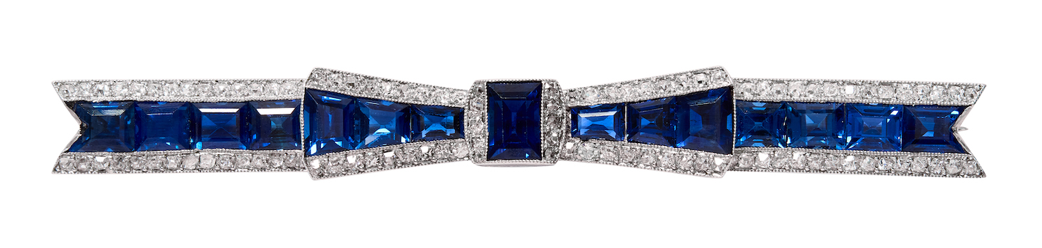 Modelled as a stylised bow, centring a rectangular-shaped sapphire flanked by a row of channel-set variously-cut sapphires within a border accented with old round-cut diamonds, the sapphires and diamonds together weighing approximately 6.22 carats and 0.75 carats respectively, mounted in platinum, length 69mm, width 8mm, total gross weight approximately 8 grams.