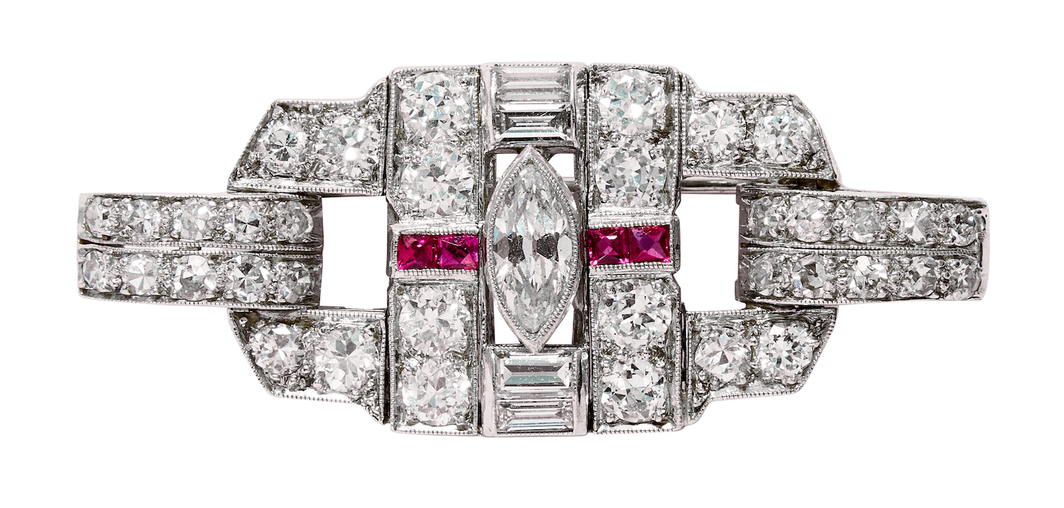 Of openwork geometric design, centring a millegrain bezel-set marquise-shaped diamond flanked by two pairs of channel-set baguette diamonds upon a surround of early round brilliant-cut diamonds, single-cut diamonds and square-shaped synthetic rubies, the diamonds together weighing approximately 3.14 carats, mounted in platinum with a 14ct white gold brooch pin, length 40mm, width 17mm, total gross weight approximately 9 grams.
