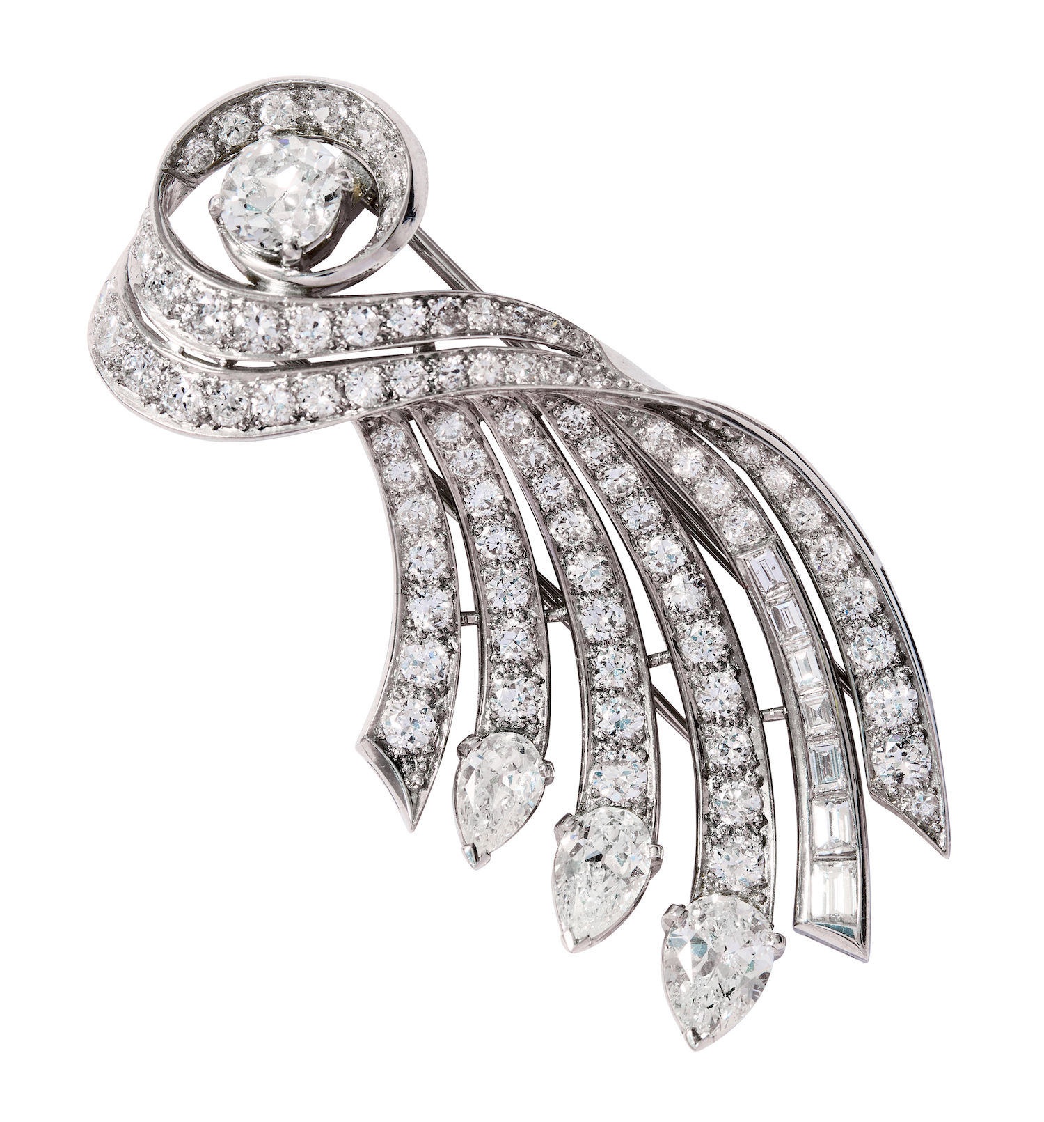 Modelled as a stylised comet, composed of a claw-set old European brilliant-cut diamond weighing approximately 1.27 carats, the scroll and spray surround accented with bead-set round brilliant-cut diamonds and channel-set baguette diamonds together weighing approximately 5.74 carats and 0.56 carats respectively, three of the central flares terminating in a claw-set pear-shaped diamond together weighing approximately 2.22 carats, mounted in platinum with a 14ct white gold brooch pin, length 60mm, width 30mm, total gross weight approximately 23 grams.