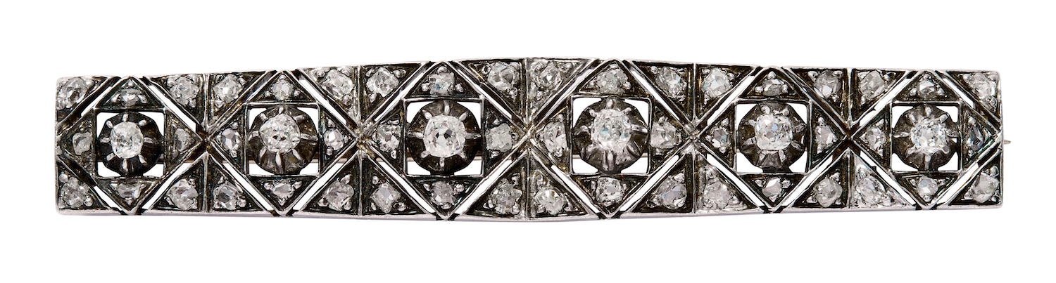Of open geometric design, composed of a row of six silver cutaway claw-set old mine-cut diamonds together weighing approximately 0.75 carats, upon a pierced silver surround surmounted on a low carat gold frame and pin, accented with further old mine-cut diamonds and rose-cut diamonds, together weighing approximately 2.24 carats and 0.48 carats respectively, length 75mm, width 13mm, total gross weight approximately 17 grams.