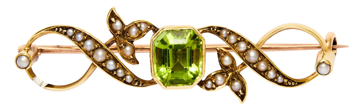 In our opinion, the peridot is of medium yellowish green colour and medium saturation, with typical inclusions, moderate abrasions and scratches throughout, not visible when worn. The seed pearls are mostly well matched for colour, of creamy hue with rosé overtones. Some wear to the metal consistent with age. The brooch pin is in good working order but may require some attention.