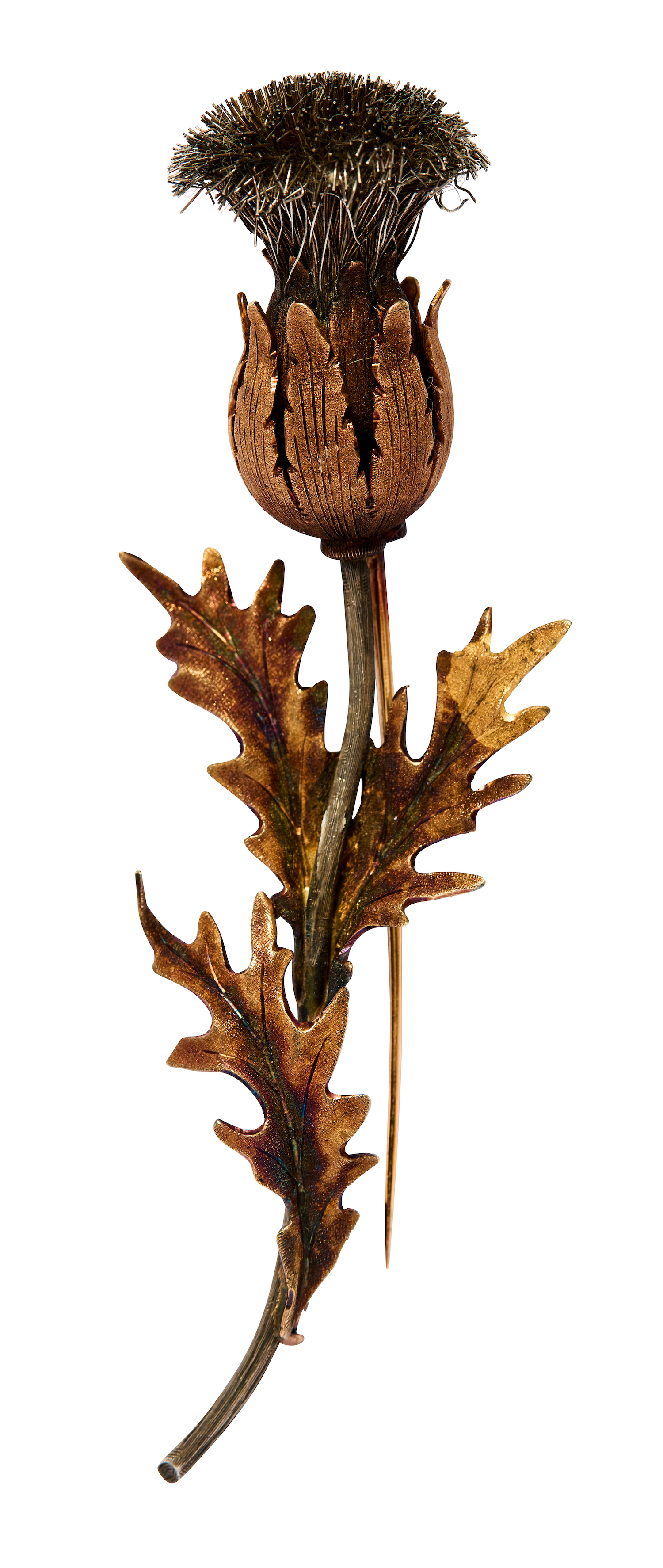 Realistically designed as a thistle sprig, length approximately 100mm, total gross weight approximately 26 grams, signed M. Buccellati.