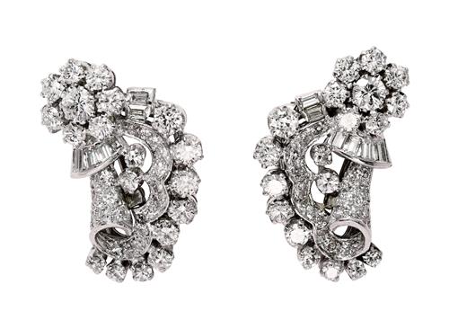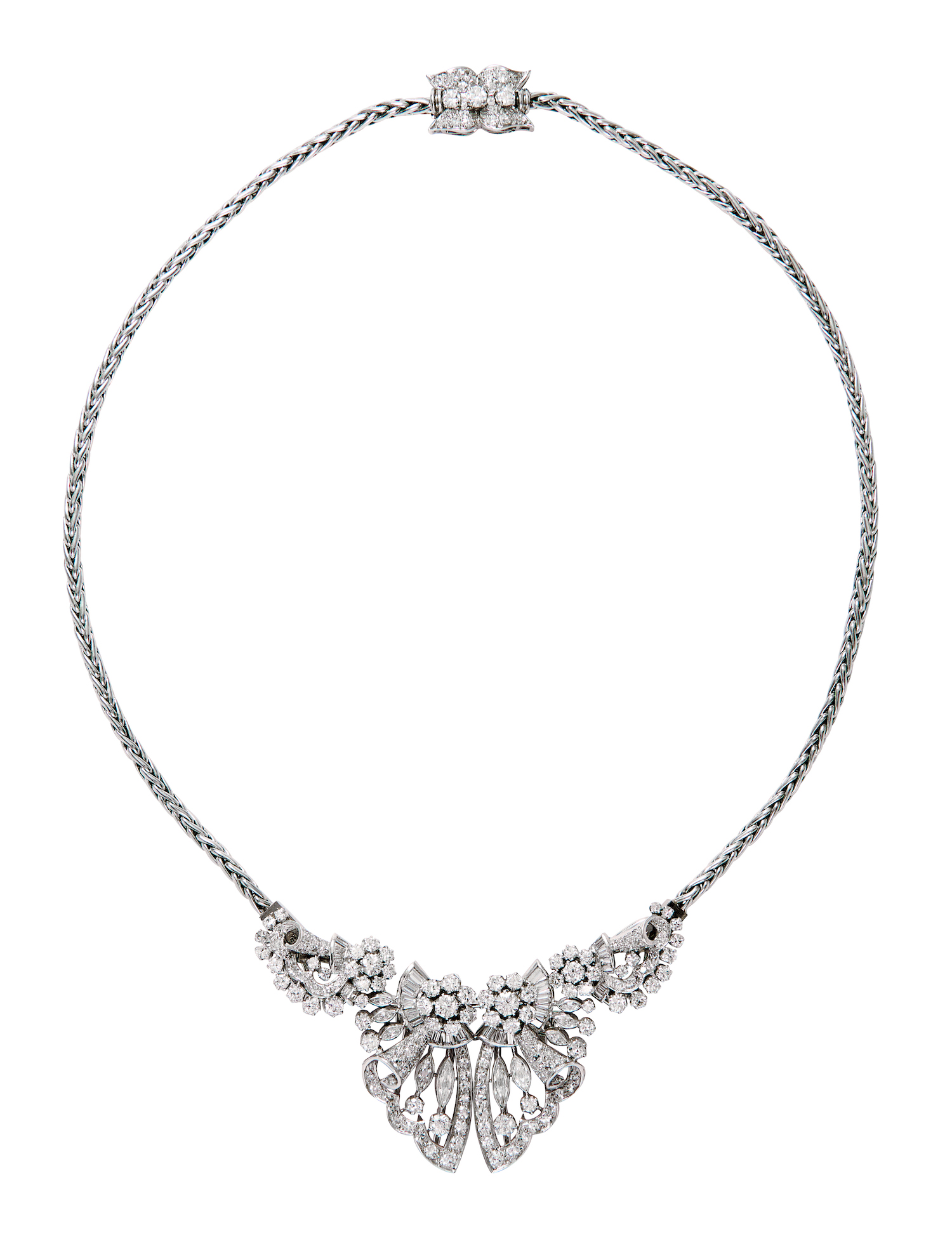 Designed as a stylised swag of ribbons set with marquise, baguette, brilliant-cut and circular-cut diamonds supported from a later platinum wheatsheaf chain completed by a bow-shaped box clasp decorated with diamonds, the diamonds together weighing approximately 8.78 carats, mounted in platinum with a 14ct white gold frame, convertible to form a double-clip brooch, a pair of double-clips, or a pair of earrings, inner circumference 435mm, total gross weight approximately 66 grams.