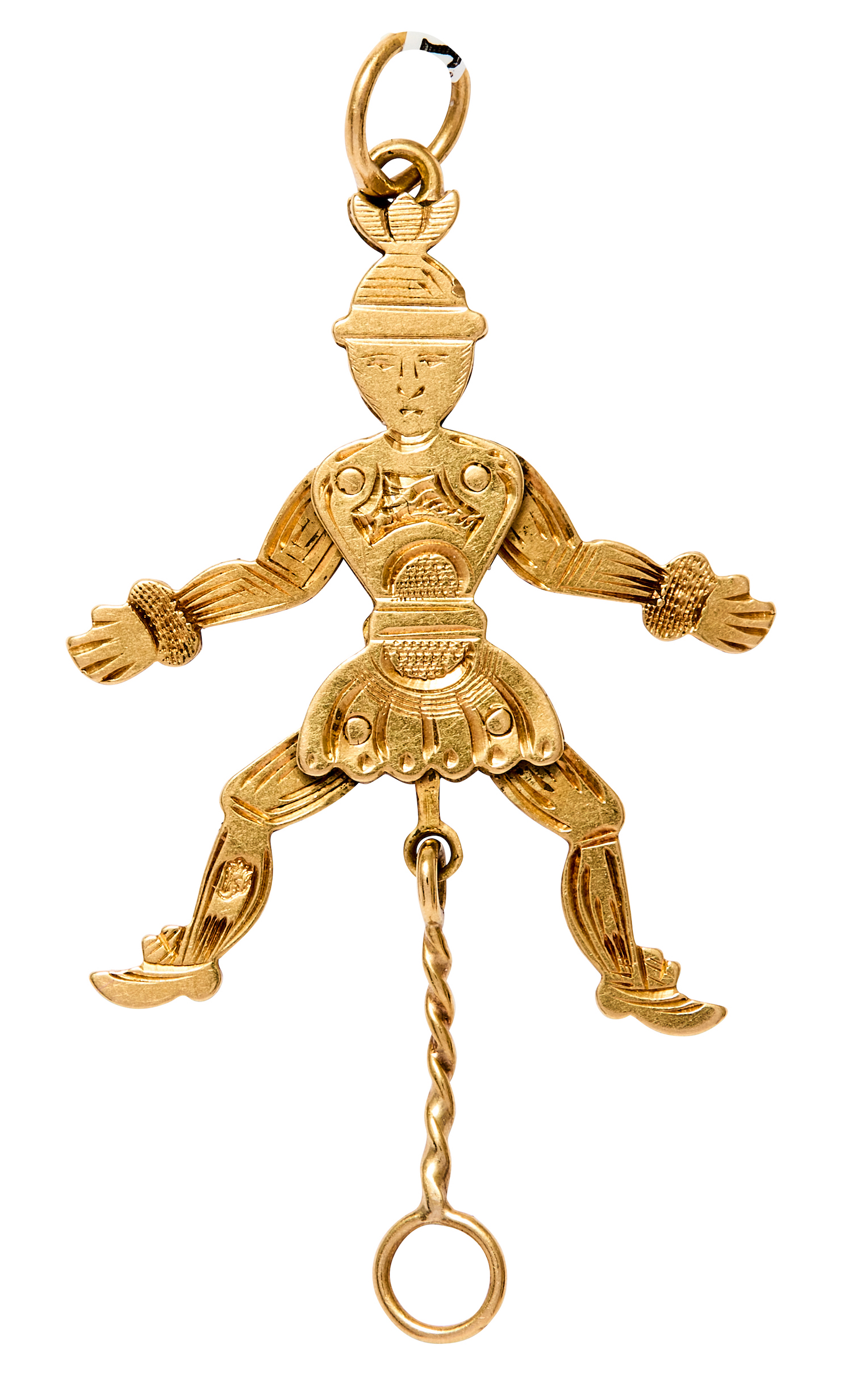 Articulated with pull-chain mechanism to move the arms and legs, engraved detail throughout, length 35mm, total gross weight approximately 1 gram.