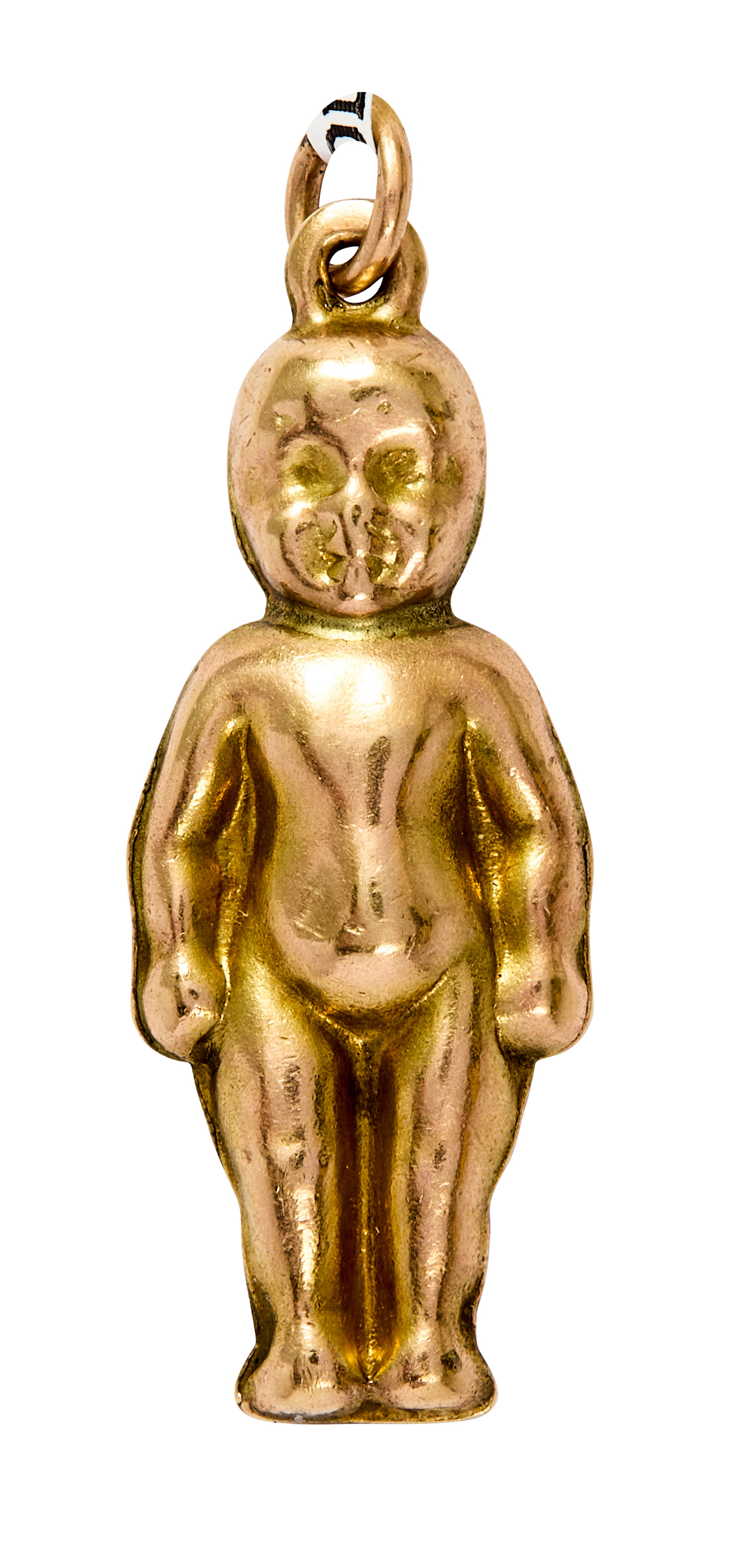 Modelled as a kewpie doll, 9ct gold, length 25mm, total gross weight approximately 1 gram.