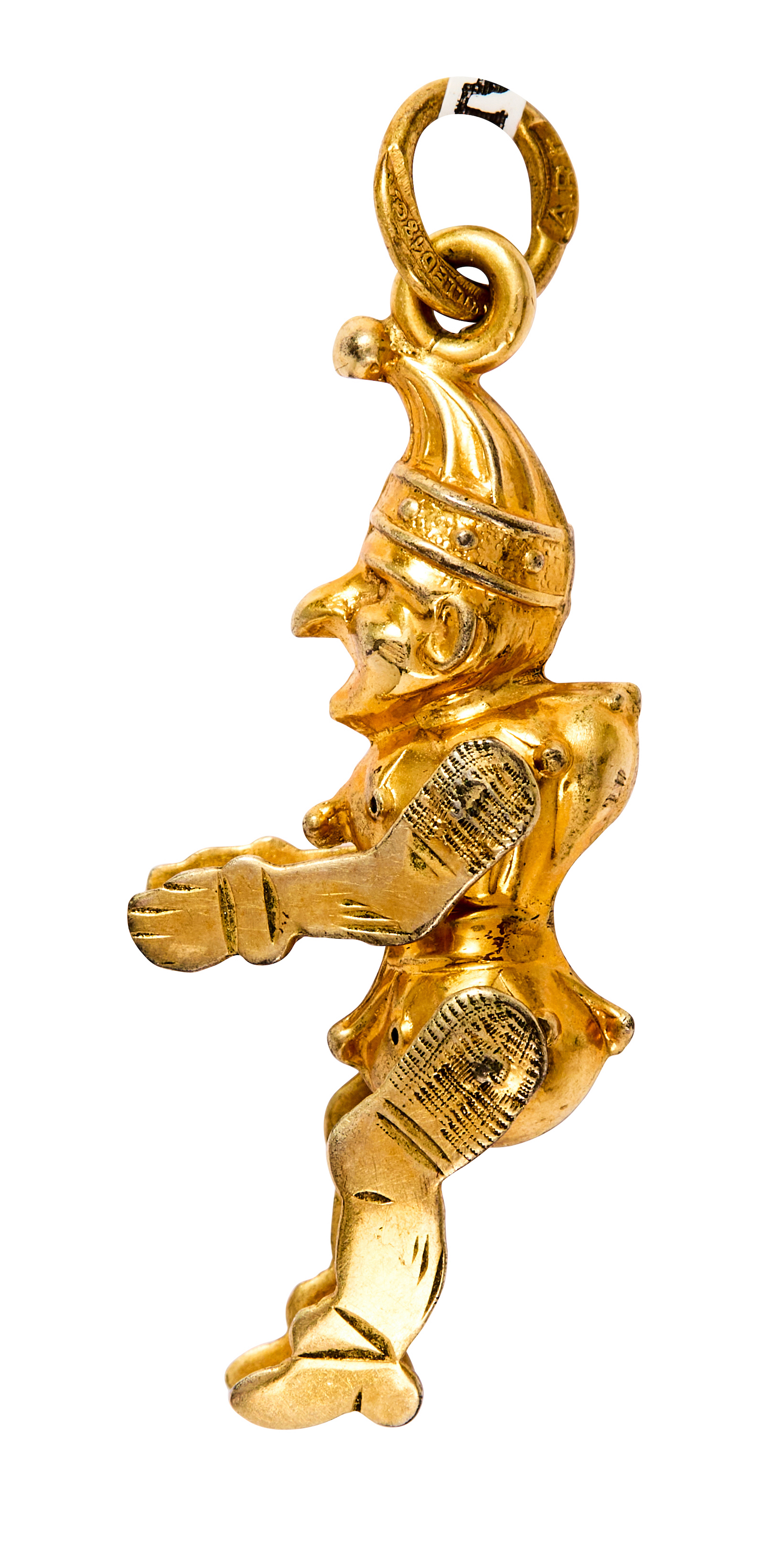 Modelled as Punch, with articulated arms and legs, engraved details throughout, base metal, length 30mm, total gross weight approximately 1 gram.
