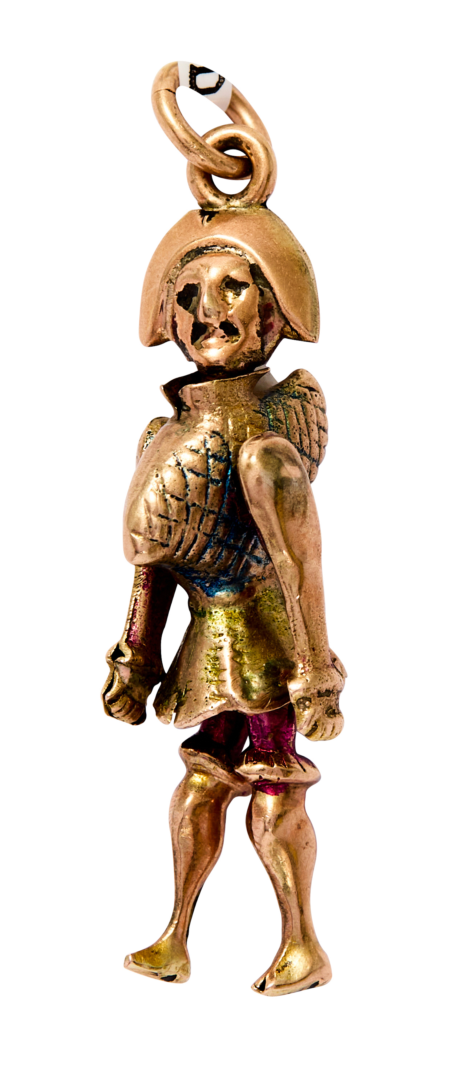 Articulated with engraved details throughout, enamelled trousers, 9ct gold, length 30mm, total gross weight approximately 1 gram.