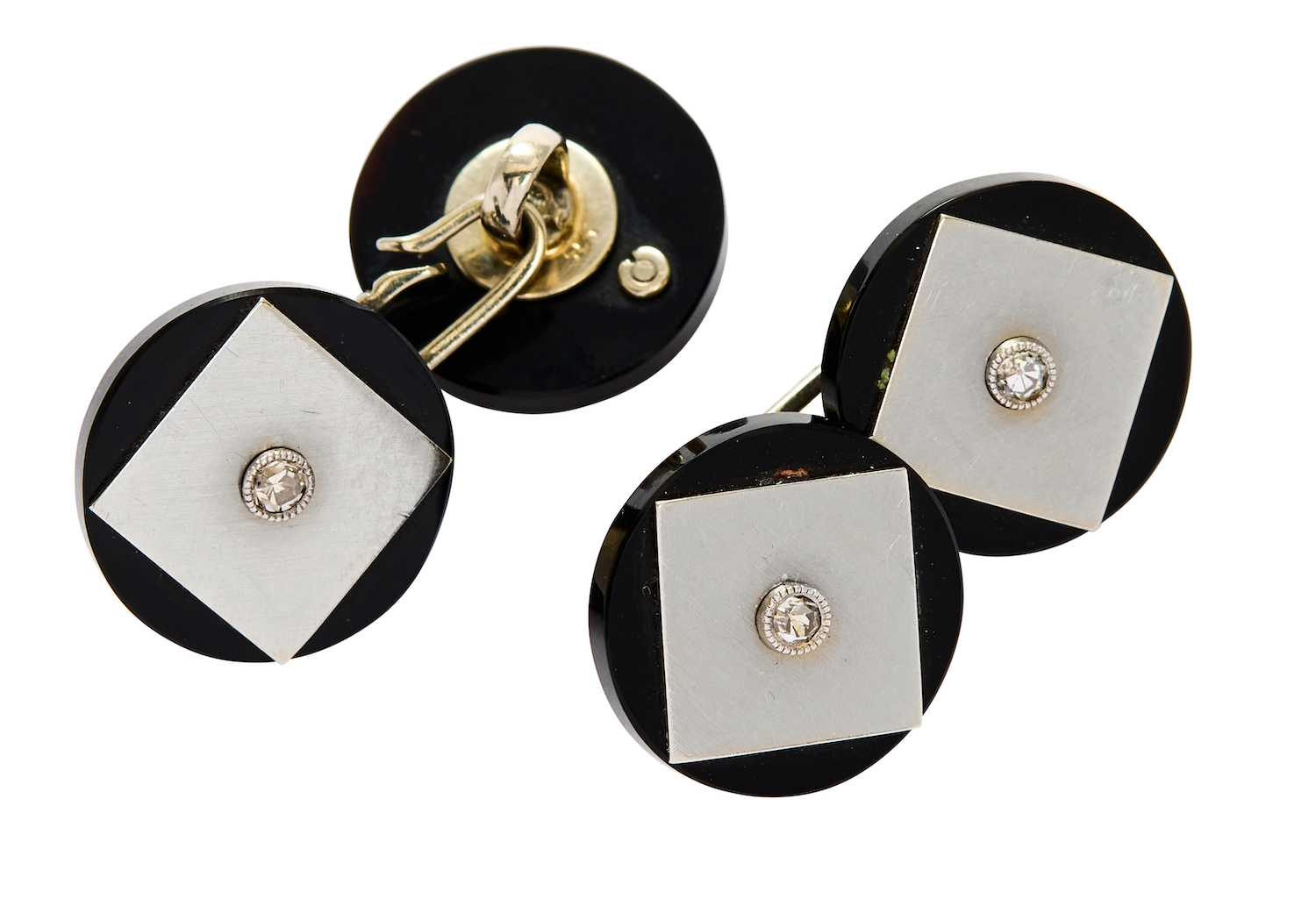 Each end composed of a 14ct white gold square plaque upon a round onyx disc, centring a millegrain bezel-set single-cut diamond, the diamonds together weighing approximately 0.08 carats, the ends connected by a removable link, diameter 13mm, total gross weight approximately 6 grams.