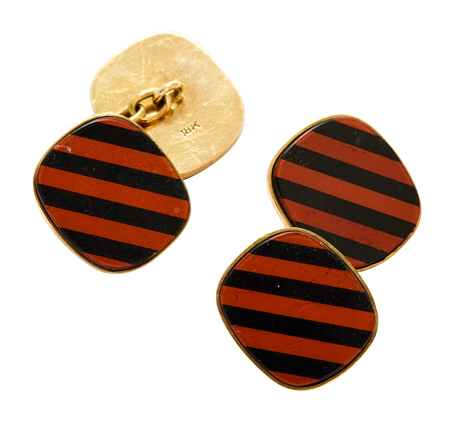 Each end composed of a brown and black striped rectangular-shaped plaque measuring approximately 14mm by 16mm, connected by articulated links, mounted in 18ct gold, total gross weight approximately 12 grams.