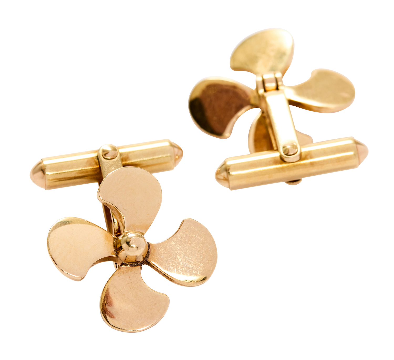 Each modelled as a propeller with toggle and post fitting, engraved 'Ernest' to the verso, 14ct gold, diameter 18mm, total gross weight approximately 10 grams.