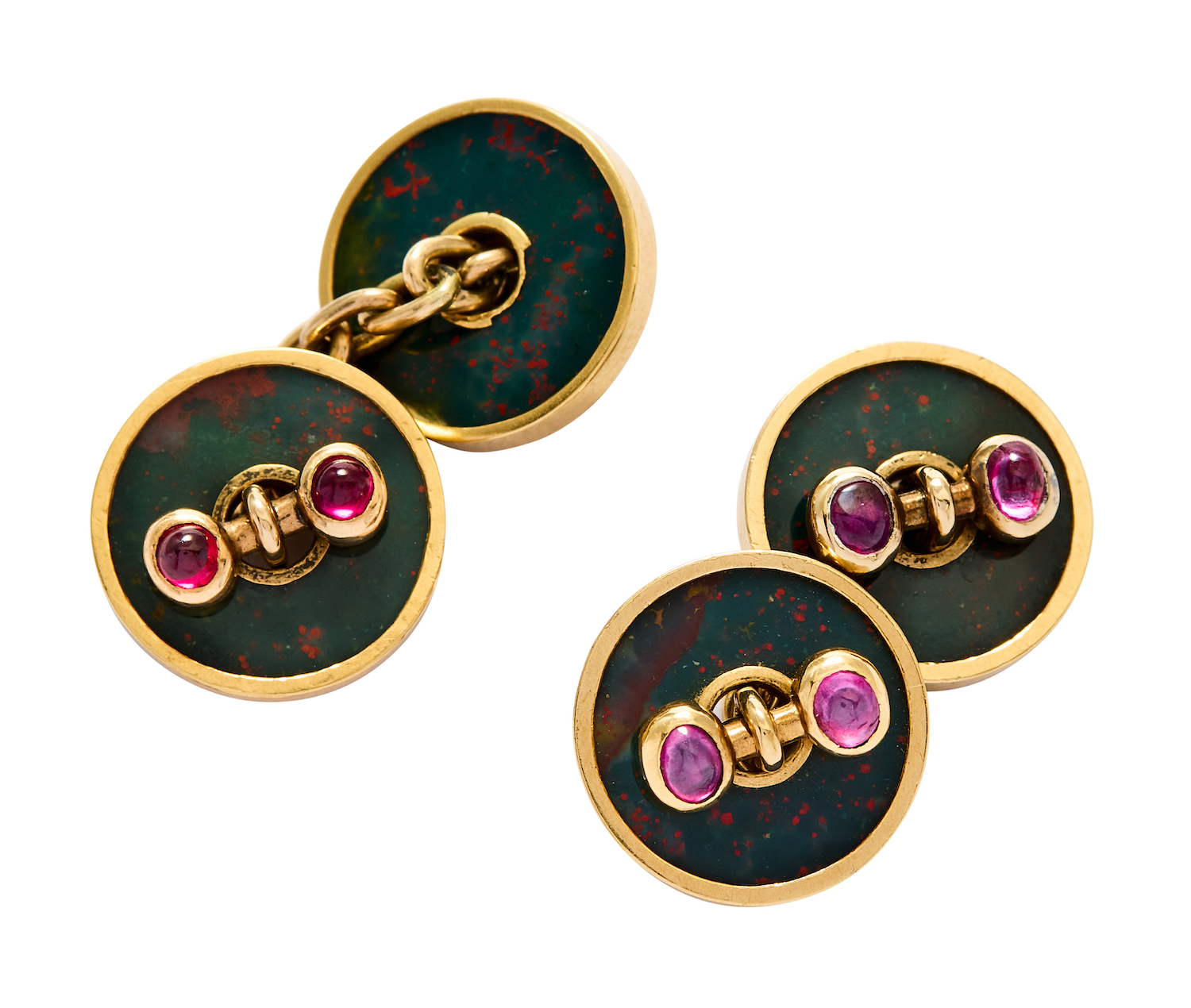 In our opinion, the delicately flecked bloodstone discs are intact, with one displaying a hairline fracture and some discolouration. The stones for each cufflink are well matched for colour, one of light to medium pinkish purple, the other of medium purplish red. There are light abrasions and scratches to the metal consistent with age and wear. The link connectors are in good working order.