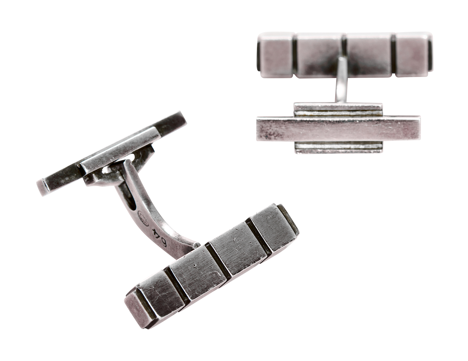 Each modelled as a ridged rectangular-shaped bar, the geometric motif toggle connected by a curved bar, sterling silver, length 20mm, width 7mm, total gross weight approximately 14 grams, maker's marks, reference 64.