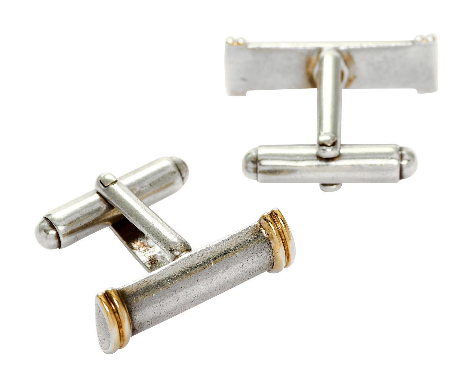 Each designed as a half curved bar between gold ridged ends, measuring 8mm by 22mm, with toggle and post backing, sterling silver and 18ct gold, total gross weight approximately 11 grams, maker's marks.