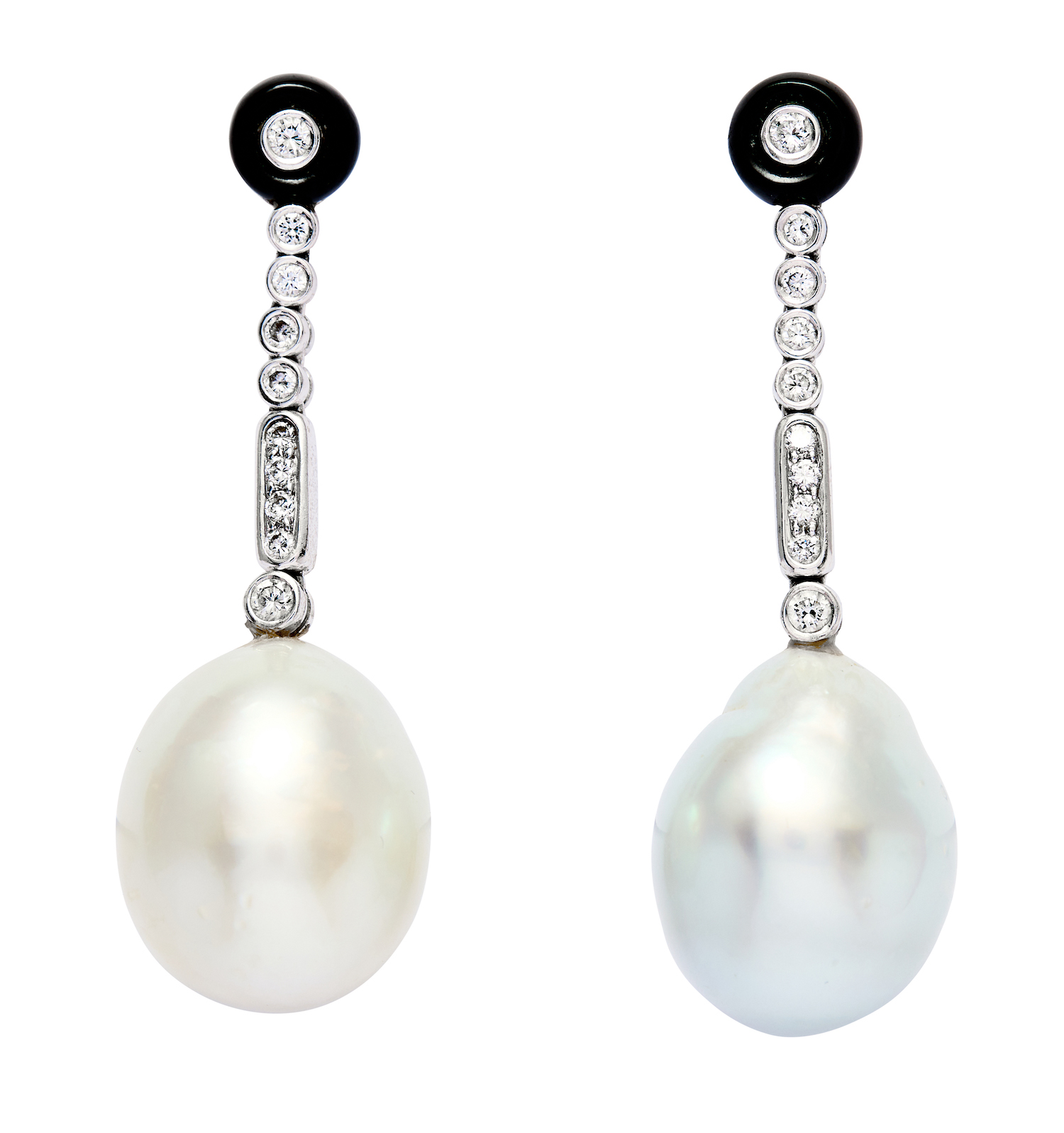 In our opinion the baroque cultured pearls are of white and creamy hue with rosé and grey overtones, with good lustre, irregular shaped and displaying natural blemishes, pitting and wrinkles. The diamonds are bright and lively, probably of G colour and SI clarity, as gauged and graded within the limitations of the cutting style and the mounting. The onyx discs are intact with some light abrasions and scratches. The mounting has wear to the metal in the form of scratches and abrasions. The post and scroll fittings for pierced ears are in good working order.