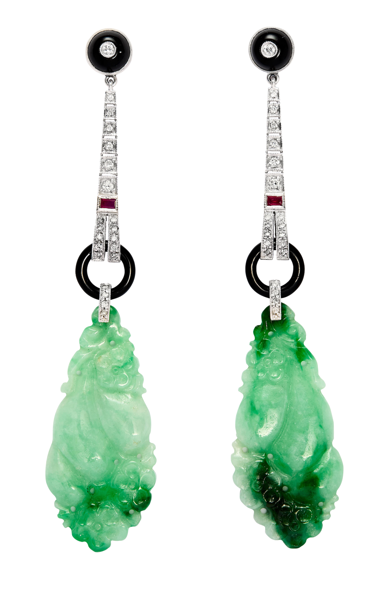 Each terminating on a carved green jadeite plaque measuring approximately 40mm by 18mm by 3mm, articulated by a diamond-set bail supported from an onyx link, the round cabochon onyx surmount centring a millegrain bead-set round brilliant-cut diamond connected by a tapered bar of geometric motif, accented with bead-set round brilliant-cut diamonds and a rectangular-shaped step-cut ruby, the diamonds and ruby together weighing approximately 0.52 carats and 0.10 carats respectively, mounted in 18ct white gold, length 85mm, width 19mm, post and scroll fittings, total gross weight approximately 15 grams.