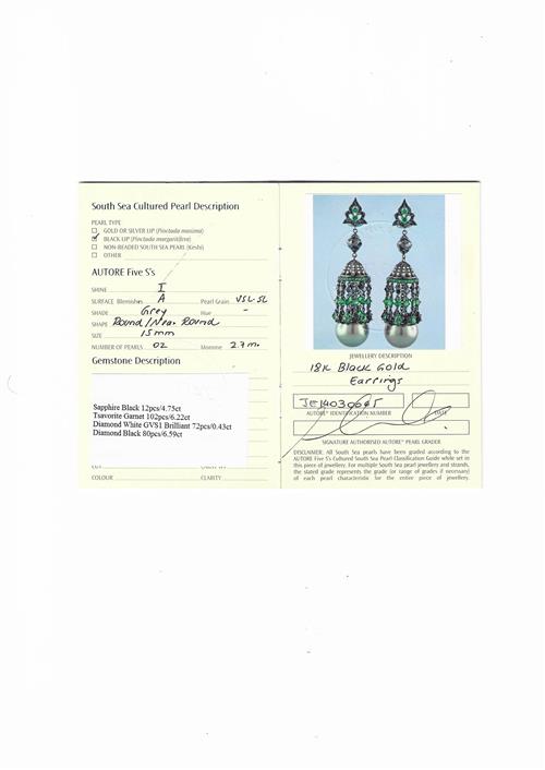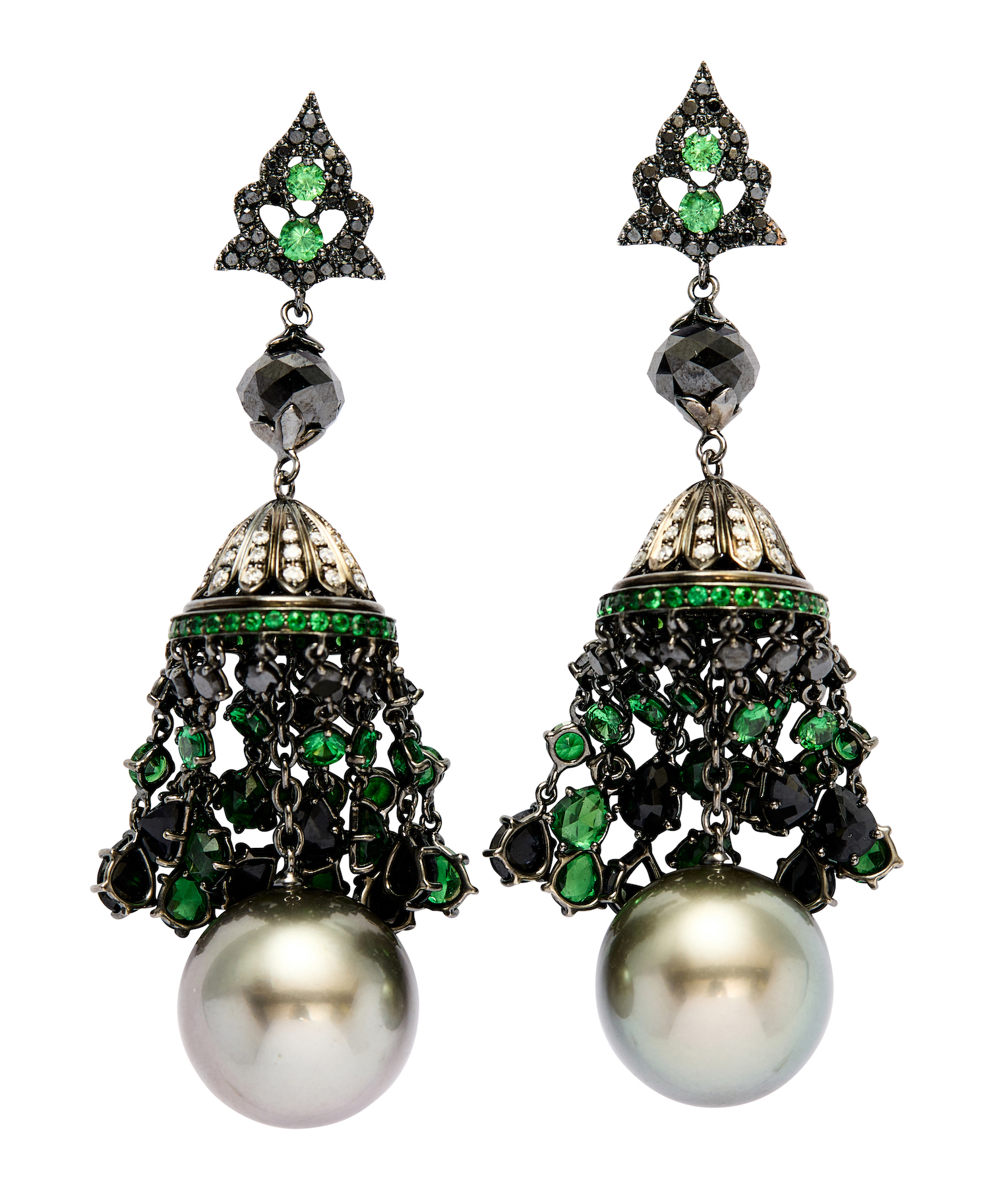 Of chandelier design, terminating on a cultured pearl of grey hue measuring approximately 15.00mm, supported from an openwork dome pavé-set with white diamonds and tsavorite garnets ringed with tassels of claw-set black sapphires, garnets and black diamonds, surmounted by an openwork geometric motif decorated with further garnets and black diamonds, between a black diamond bead connector, the black sapphires, tsavorite garnets, near colourless diamonds and black diamonds weighing approximately 4.75 carats, 6.22 carats, 0.43 carats and 6.59 carats respectively, mounted in 18ct blackened gold, length 67mm, post and clip fittings, total gross weight approximately 30 grams.