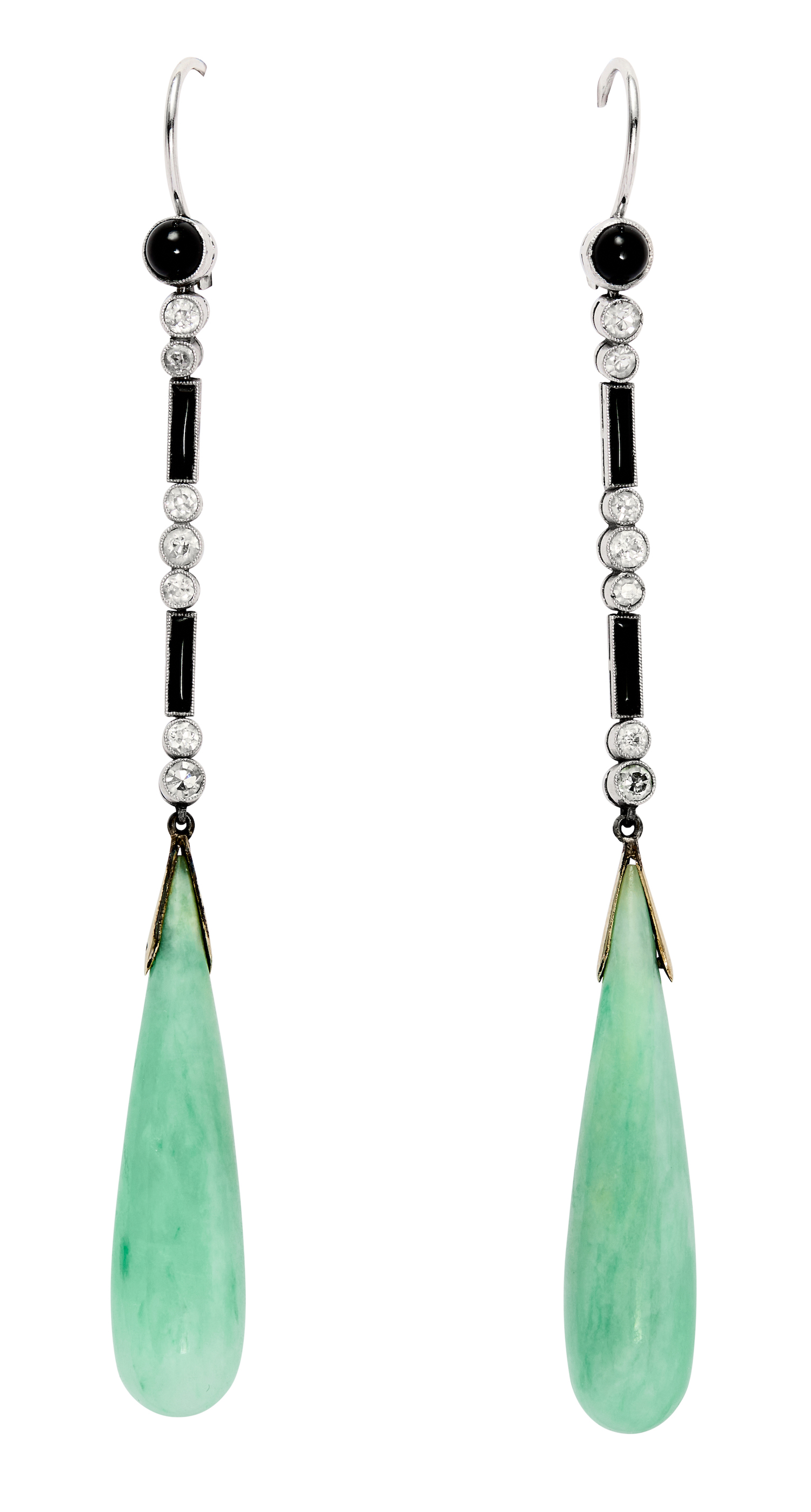 Each articulated throughout, terminating on a tapered green jadeite drop measuring approximately 37mm by 8mm, supported from a row of millegrain bezel-set rectangular-shaped onyx, single-cut diamonds and early round-cut diamonds, surmounted by a round cabochon onyx, the diamonds together weighing approximately 0.80 carats, mounted in platinum, length 85mm, lever back fittings, total gross weight approximately 12 grams.