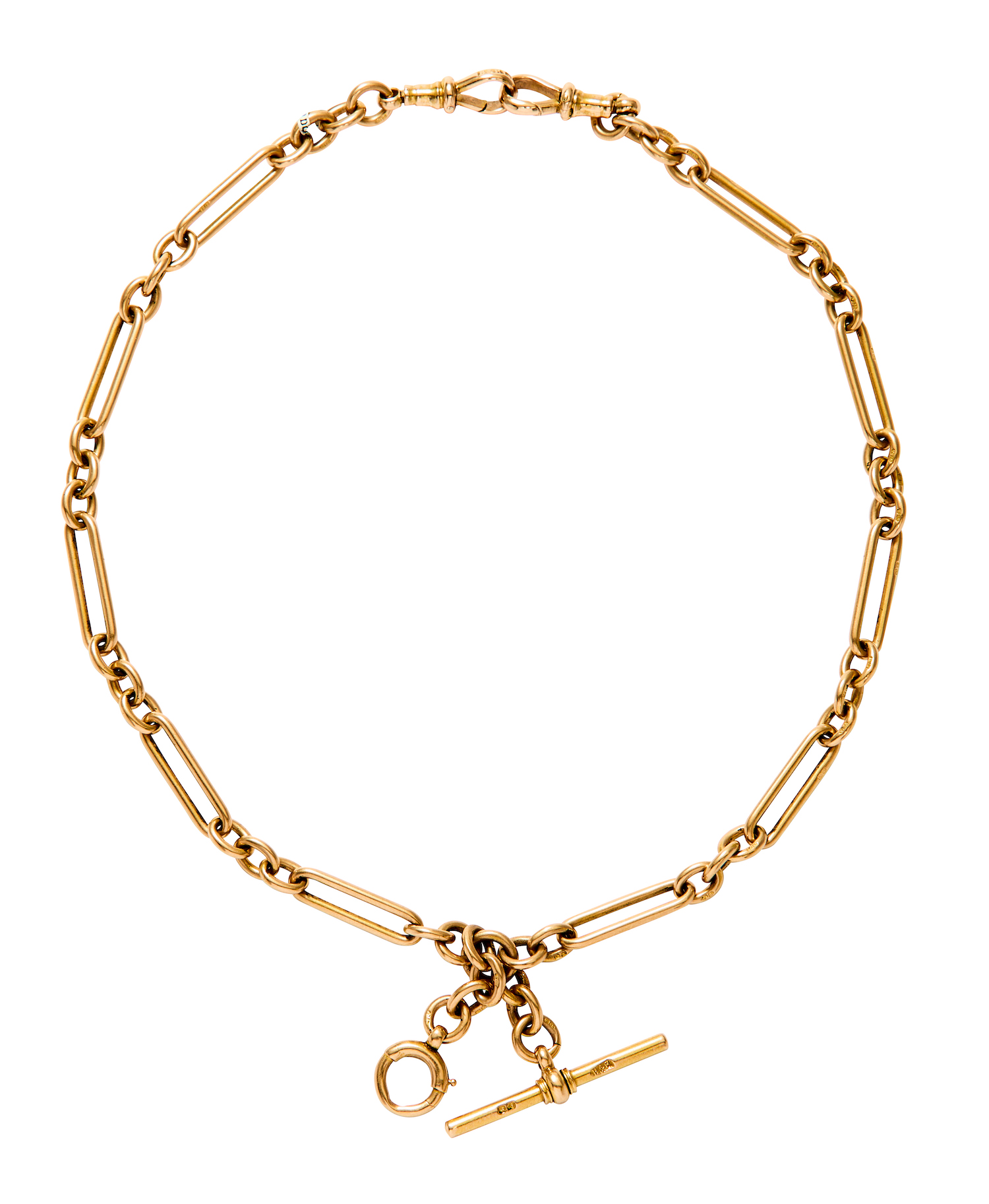 Comprising trombone and oval links suspending a T-bar fitting, completed by two swivel clasps with additional links and spring clasp, 18ct gold, length 455mm, total gross weight approximately 69 grams, British assay marks, maker's marks.