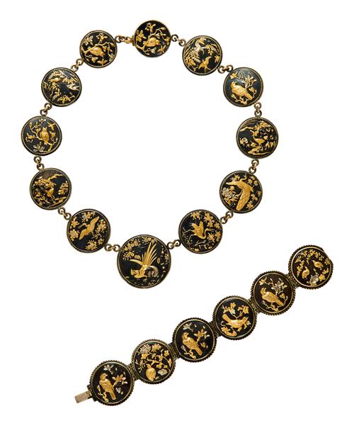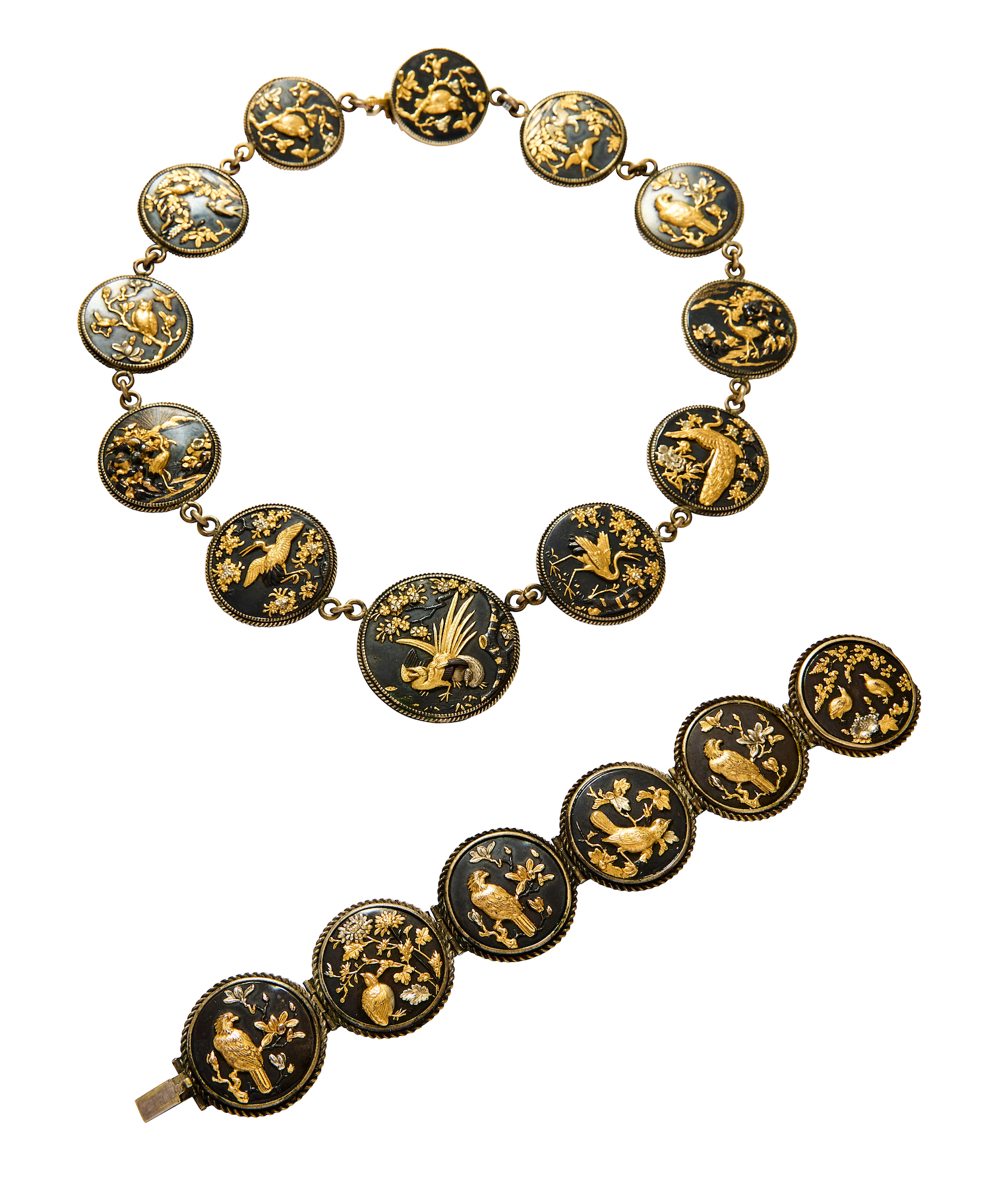 Comprising of: a necklace composed of 12 circular plaques, each inlaid with copper and 9ct gold plated shakudo-work, depicting various species of bird, including crane, pheasant and quail, amongst flowers and foliage within borders of corded decoration; the six plaque bracelet en suite, necklace length 455mm, bracelet length 180mm, total gross weight approximately 139 grams (2).