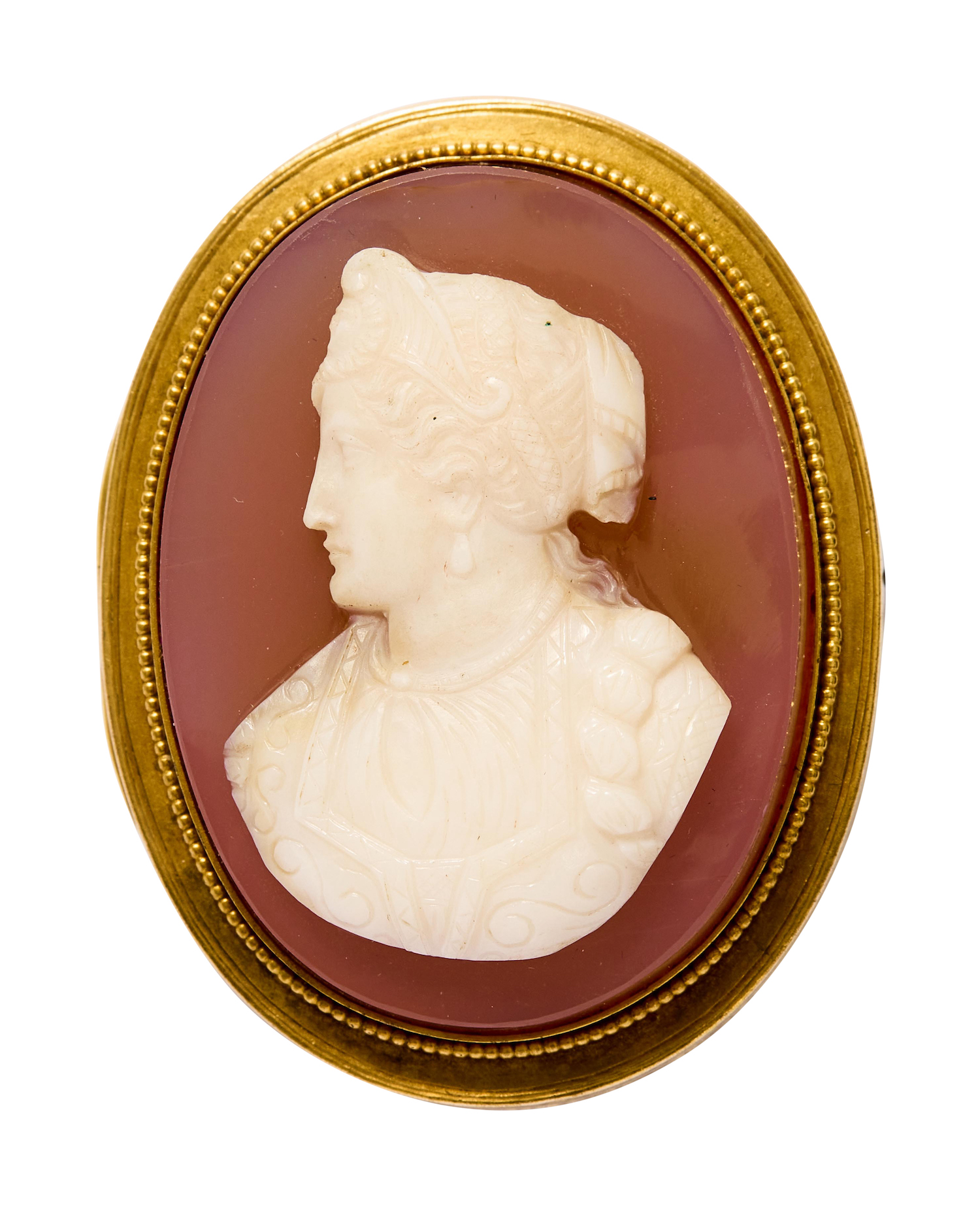 In our opinion, the carved sardonyx is mostly intact, with only a possible small loss to the bottom of the subject's hair scarf. Some wear and minor discolouration to the metal consistent with age. The hinge mechanism and brooch pin are in good working order.