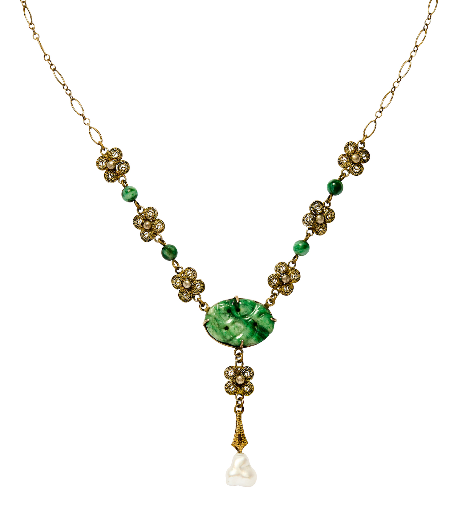 In our opinion, the carved opaque jadeite plaque and beads are intact and of mottled light to dark green. The keshi pearl is of white hue with rosé overtones. Moderate wear to the metal consistent with age. The clasp is in good working order.