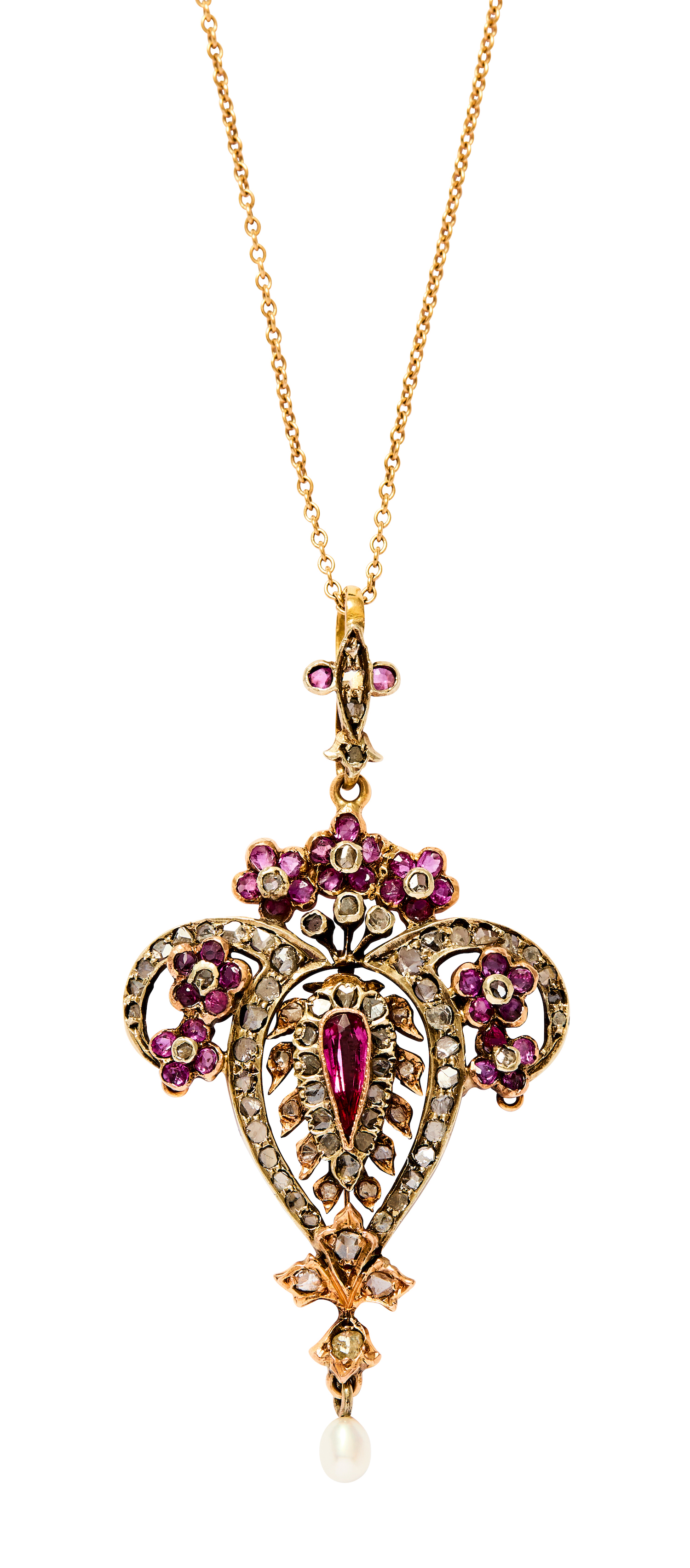 Of foliate design, centring a pear-shaped mixed-cut synthetic ruby upon an openwork surround, set throughout with rose-cut diamonds and rubies together weighing approximately 1.00 carat and 0.70 carats respectively, terminating in a diamond and seed pearl drop, the articulated bail supported from a 9ct gold fine trace chain, mounted in 15ct gold, length 60mm, width 30mm, total gross weight approximately 10 grams.