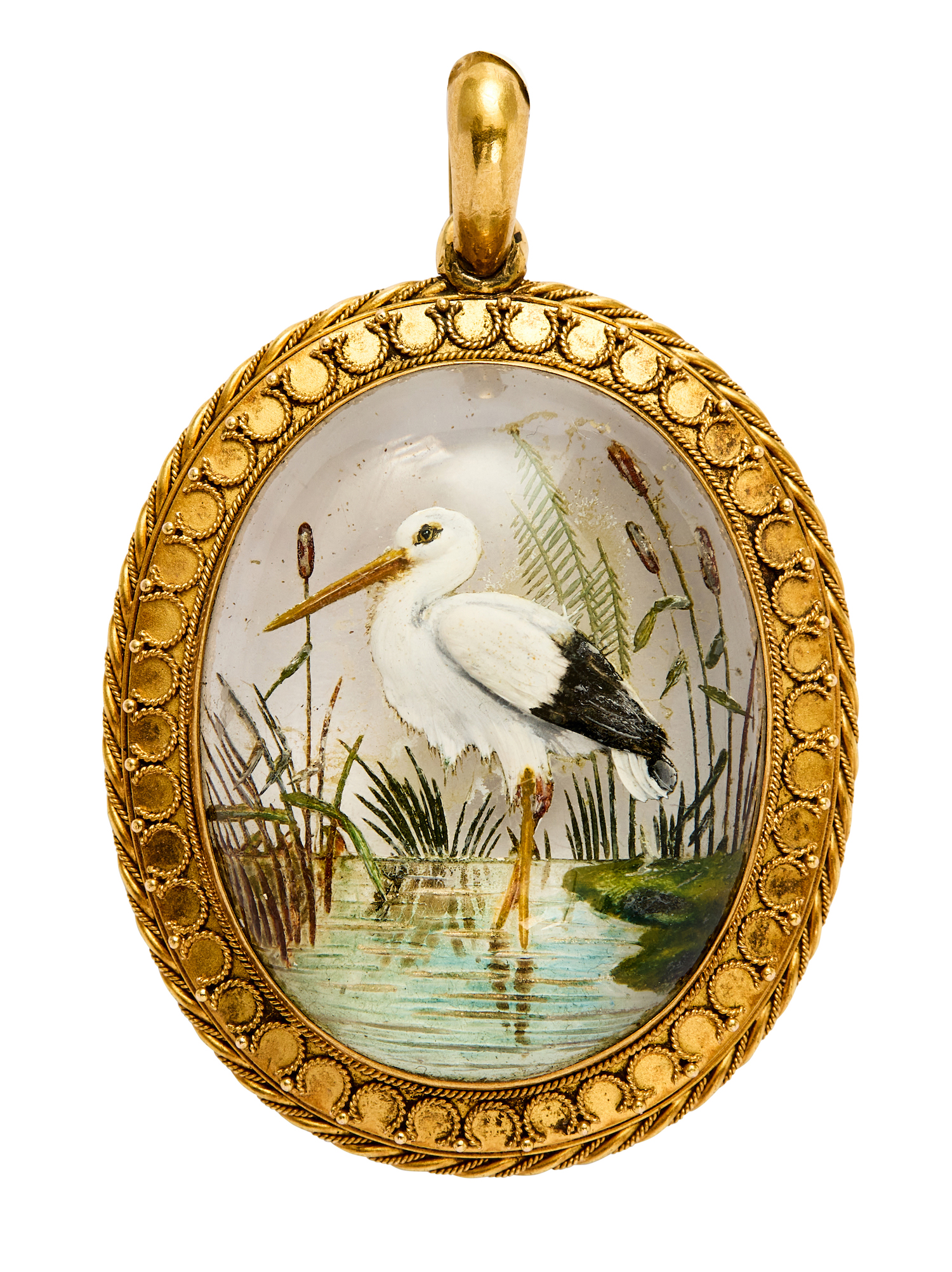 The oval cabochon rock-crystal reverse engraved and painted to depict a stork wading amongst bullrushes, within a decorative applied surround of rope and braid motif, length 50mm, width 35mm, total gross weight approximately 17 grams.